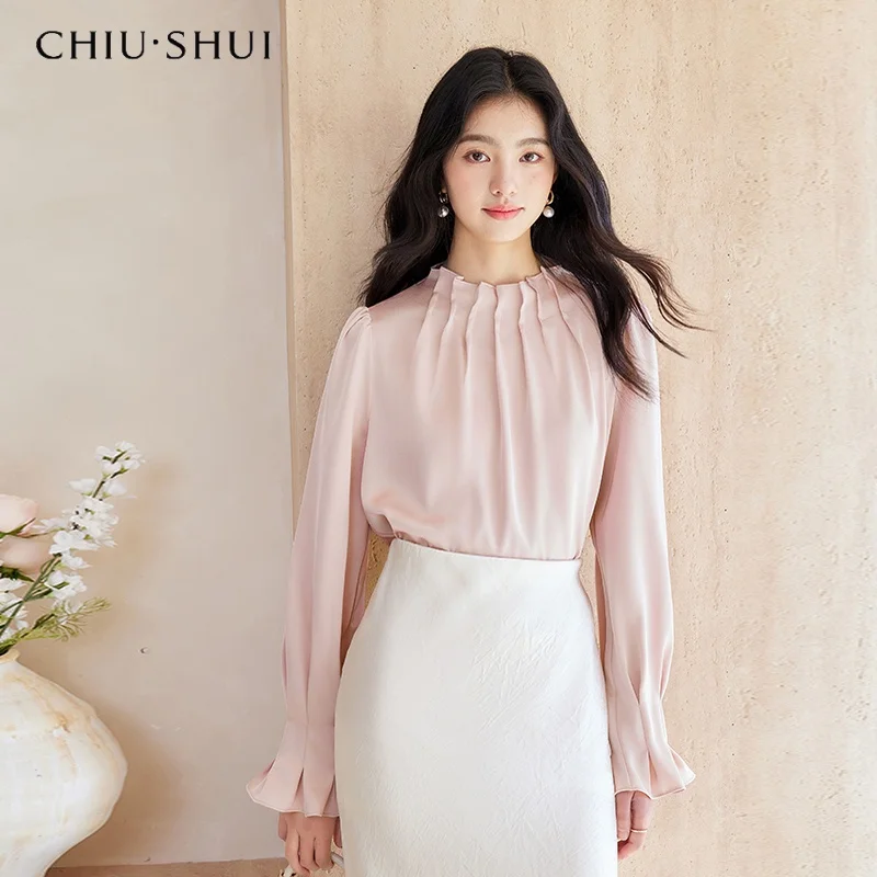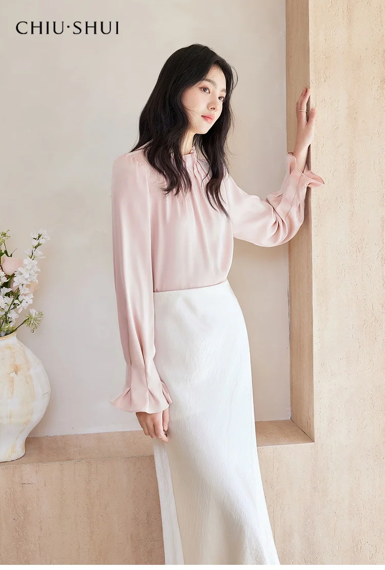 Women's Chiffon Blouse Top Stand Collar Button Shirt with Lotus Leaf Sleeves Solid Color High-end French Chiffon for Commuting