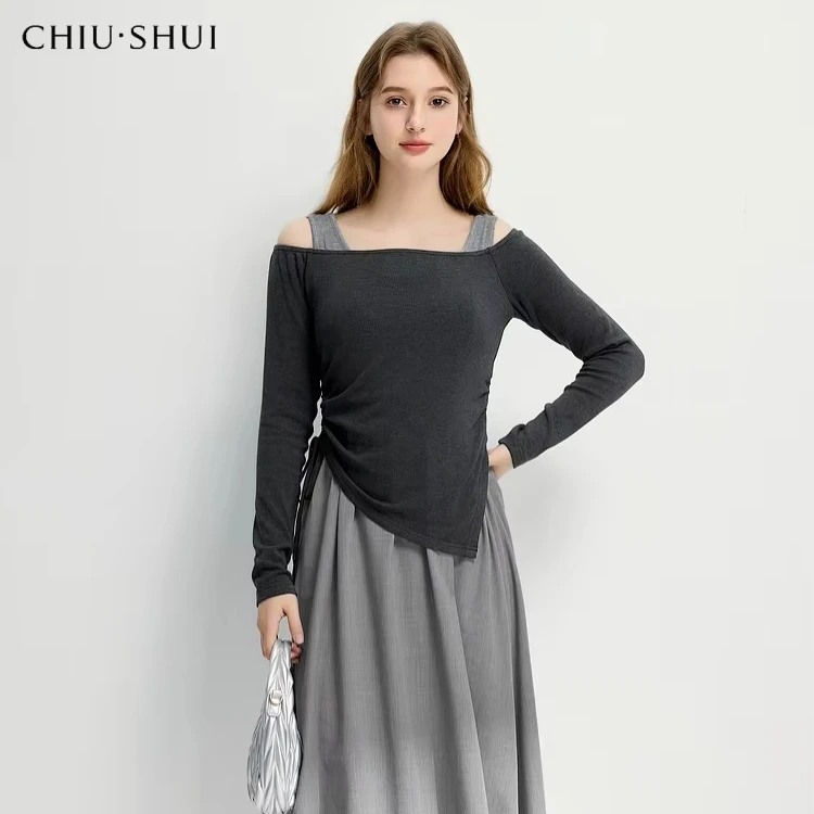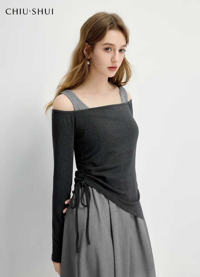 Elegant Off Shoulder Women Dress Two Piece Design Black Top Gray Skirt for Daily Chic Outfit Trendy Style