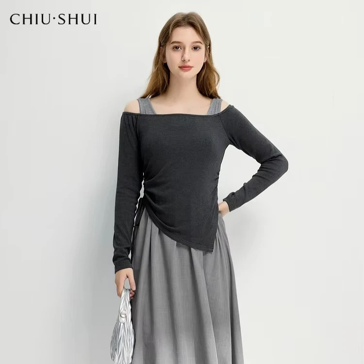 ZYHT 73849 European Wholesale Fashion Casual One Shoulder Ruched Maxi Dress Side Slit Pleated Long Sleeve Dresses for Women