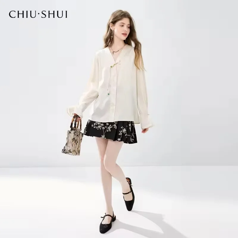 Trendy Womens Two Piece Set Stylish V Neck Silk Like Blouse With Bow Floral Printed Pleated Skirt Fashion Office Casual Outfit