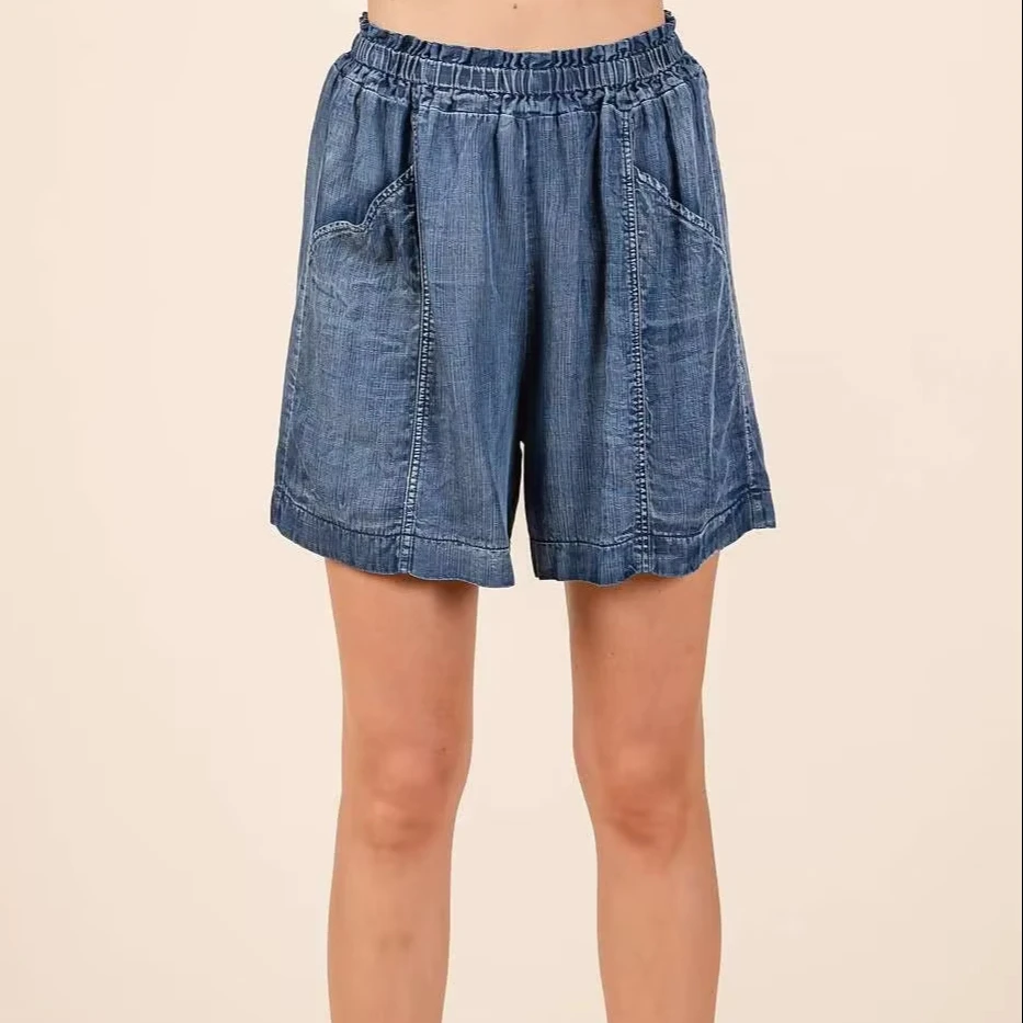 OEM Trendy Women's Jeans Shorts Bundle Waist Mid Rise Cargo Shorts Flared Leg Blue Girls Denim Jeans for Summer
