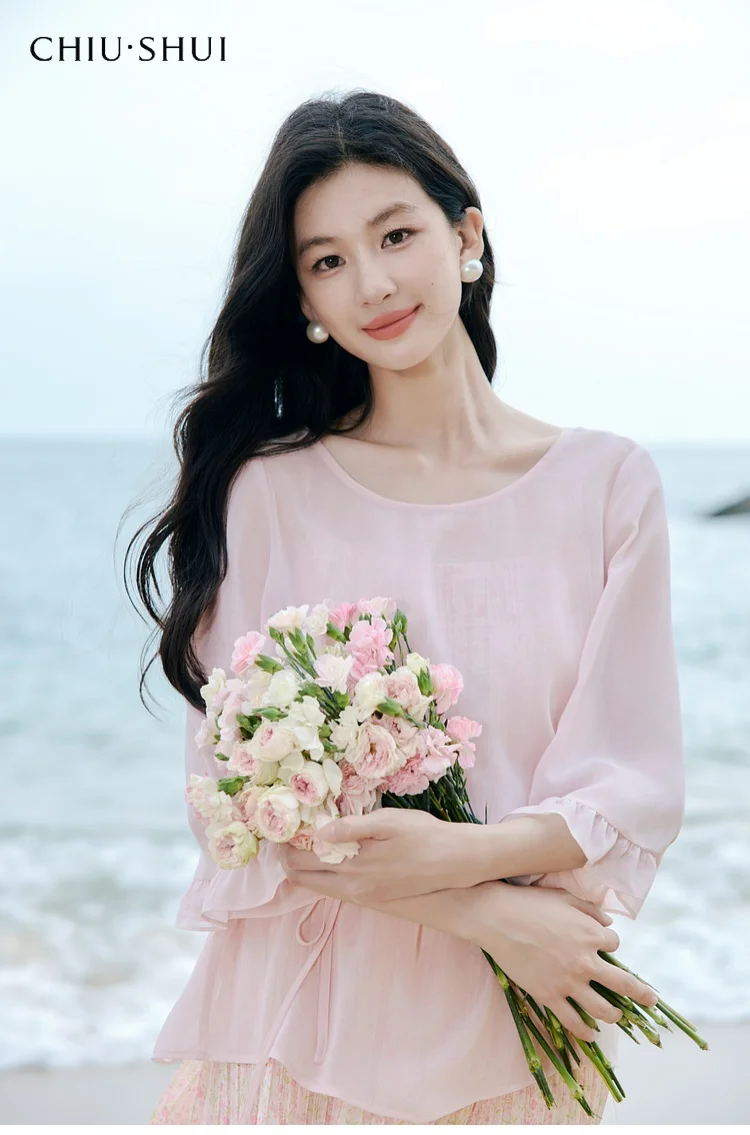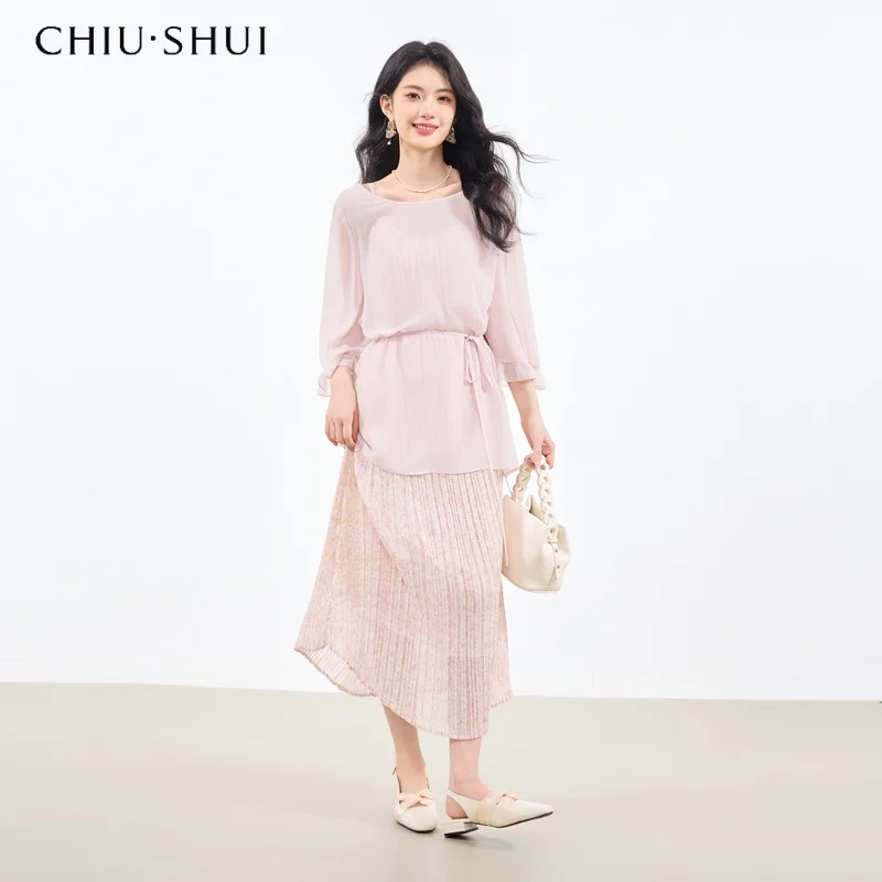 Romantic Womens Two Piece Set Chiffon Top With Ruffle Sleeves Pleated Skirt for Summer Beach Outings