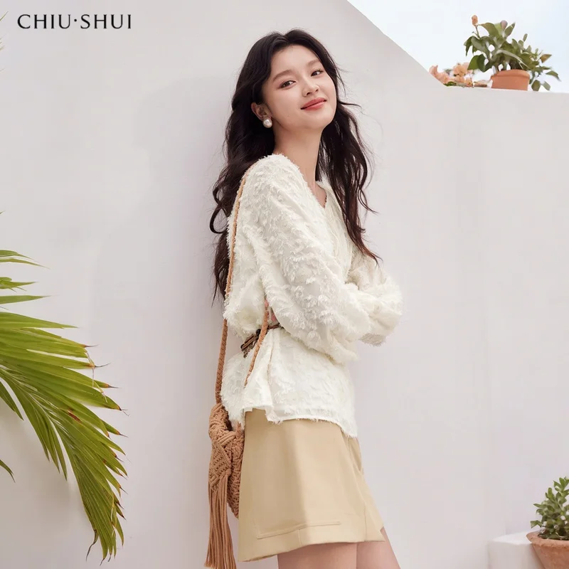 ZYHT 82024 White Blouse with Ruffled Cap Sleeves V-Neck Blouses Et Chemises Pour Femmes White Blouses for Women