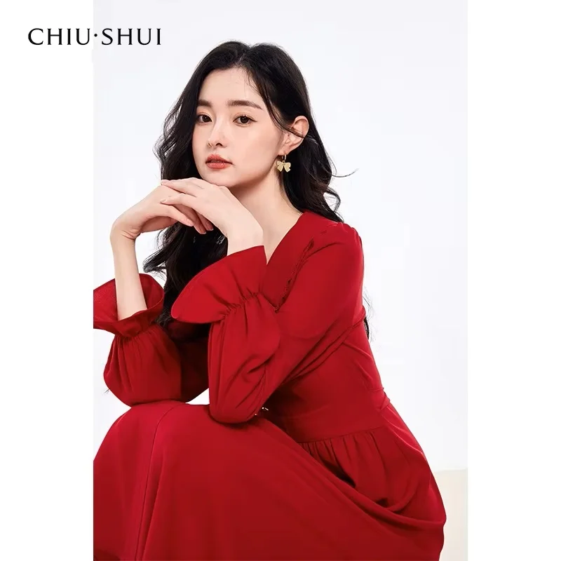 Hot Selling New Arrival Women's Red Dress Solid Pattern Natural Waistline New Year's Gown