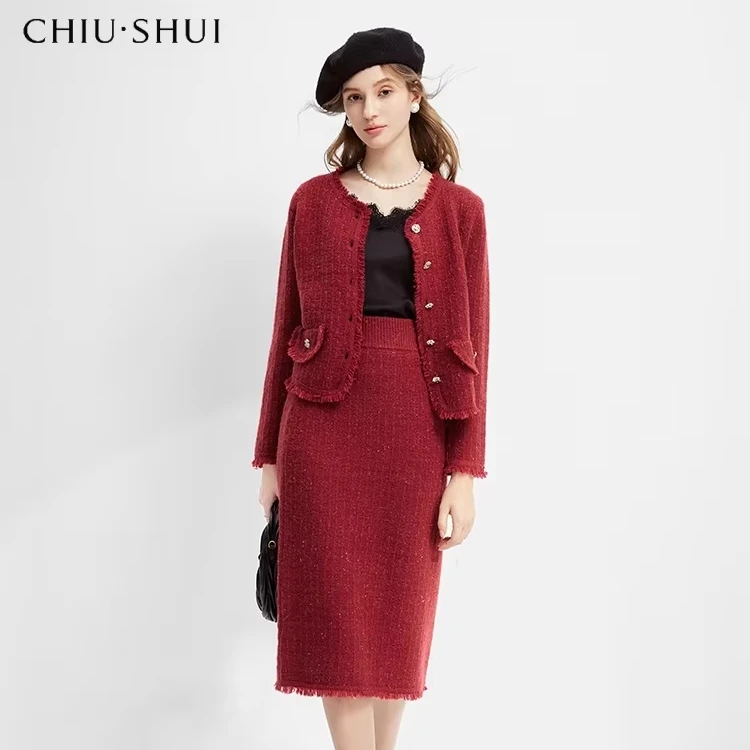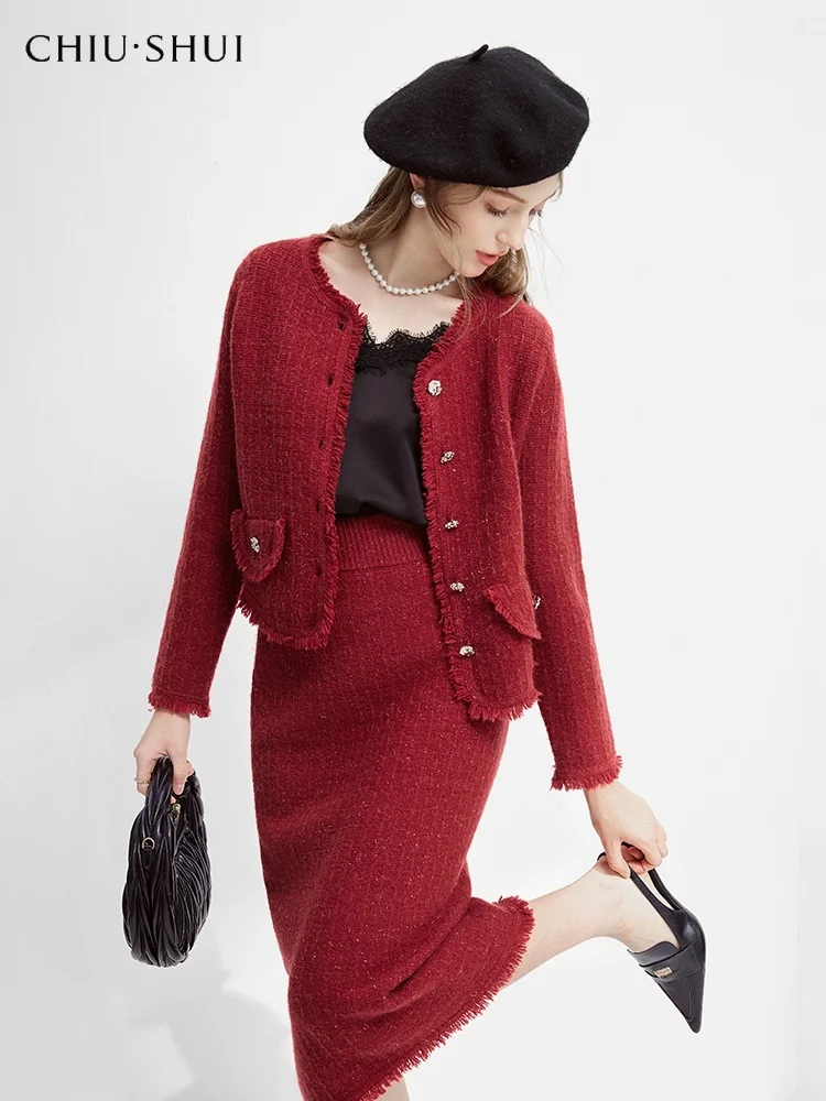 Little Fragrant Style Knitted Suit New Year Wear Spring New Red Two Piece Dress for Christmas Women