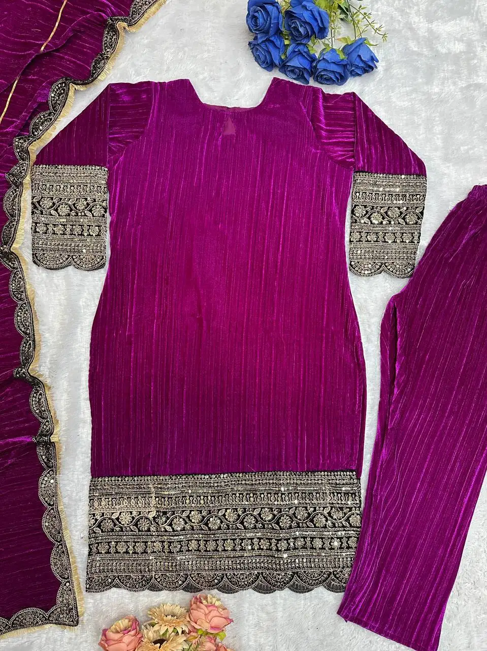 ZYHT 21938 Black Velvet Mini Dress Square Neck Long Puff Sleeves with Pearl Trim & Crystal Dess Flared Scalloped Hem Dresses