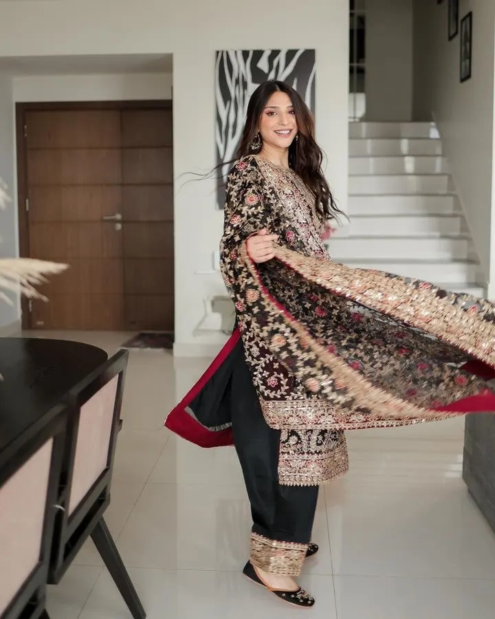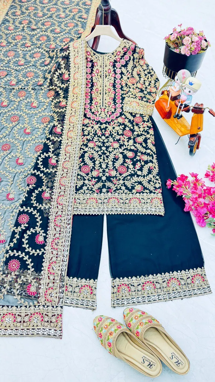 Elegant Bollywood Style New Designer Faux Georgette Salwar Suit with Sequin Embroidery Top Pant & Dupatta for Women's Party Wear