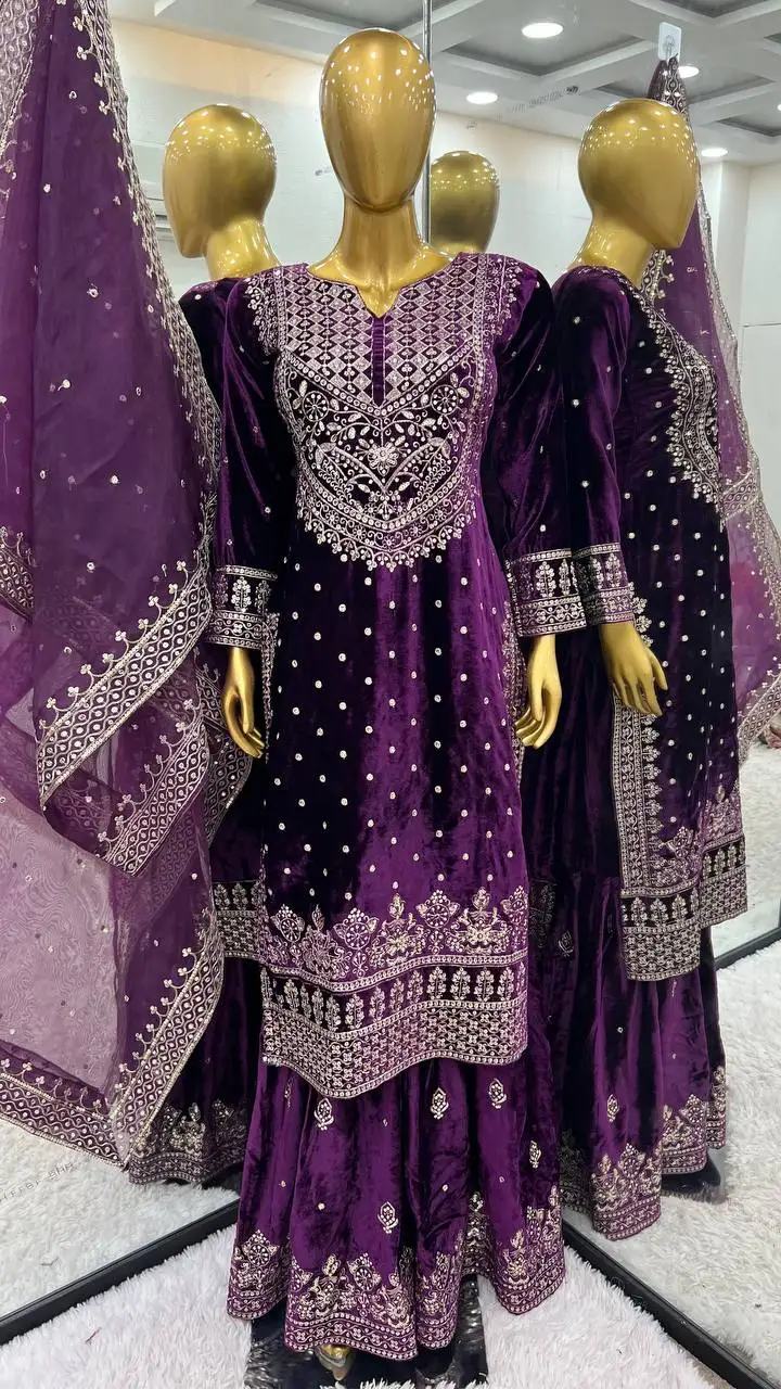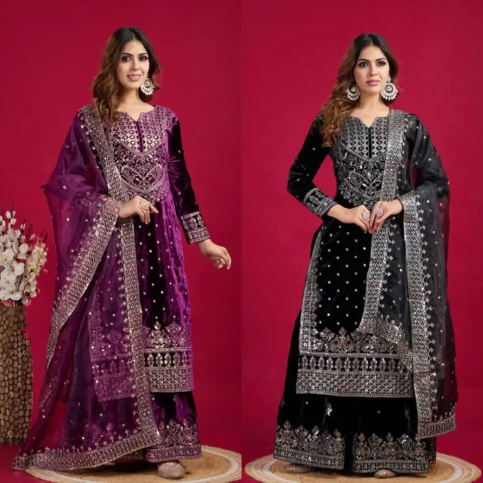 Indian Dress New Designer Viscose Velvet Embroidery Sequence Work Top Sharara Dupatta Wine Wedding Party Wholesaler
