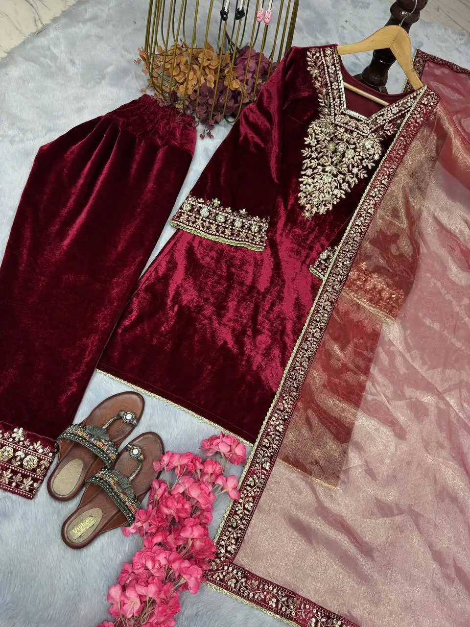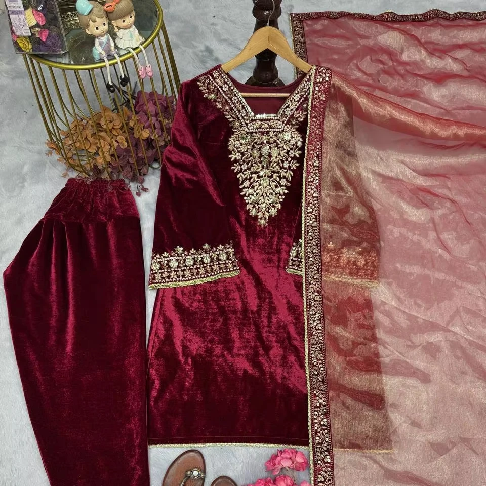 Antra Lifestyle Eco-Friendly Velvet Embroidered Handmade Top Bottom Dupatta Set Designer Floral Pattern Streetwear Natural Party