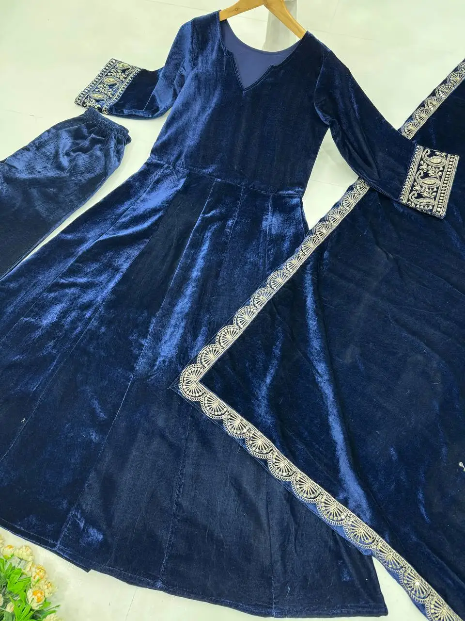Readymade Indian Regular Gown & Dupatta Set Full Stitching Velvet with Thread Work Winter Party Wear Outfit at Wholesale Price
