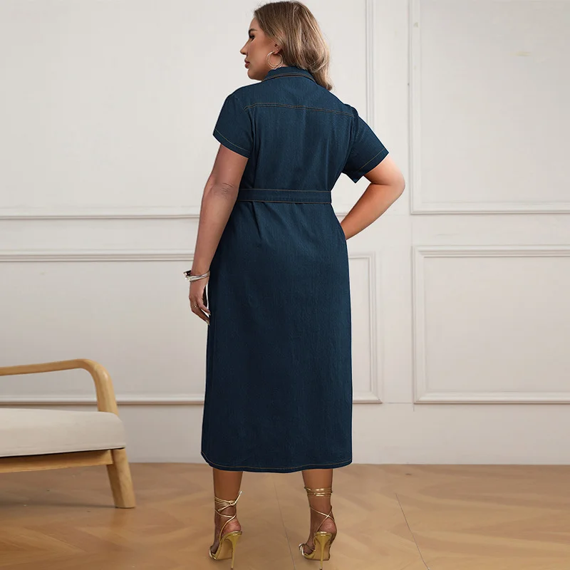 Women's Plus Size Denim Dresses Casual Short Sleeve Long Maxi Jean Turn-Down Collar Women Long Maxi Jean Dresses With Blet