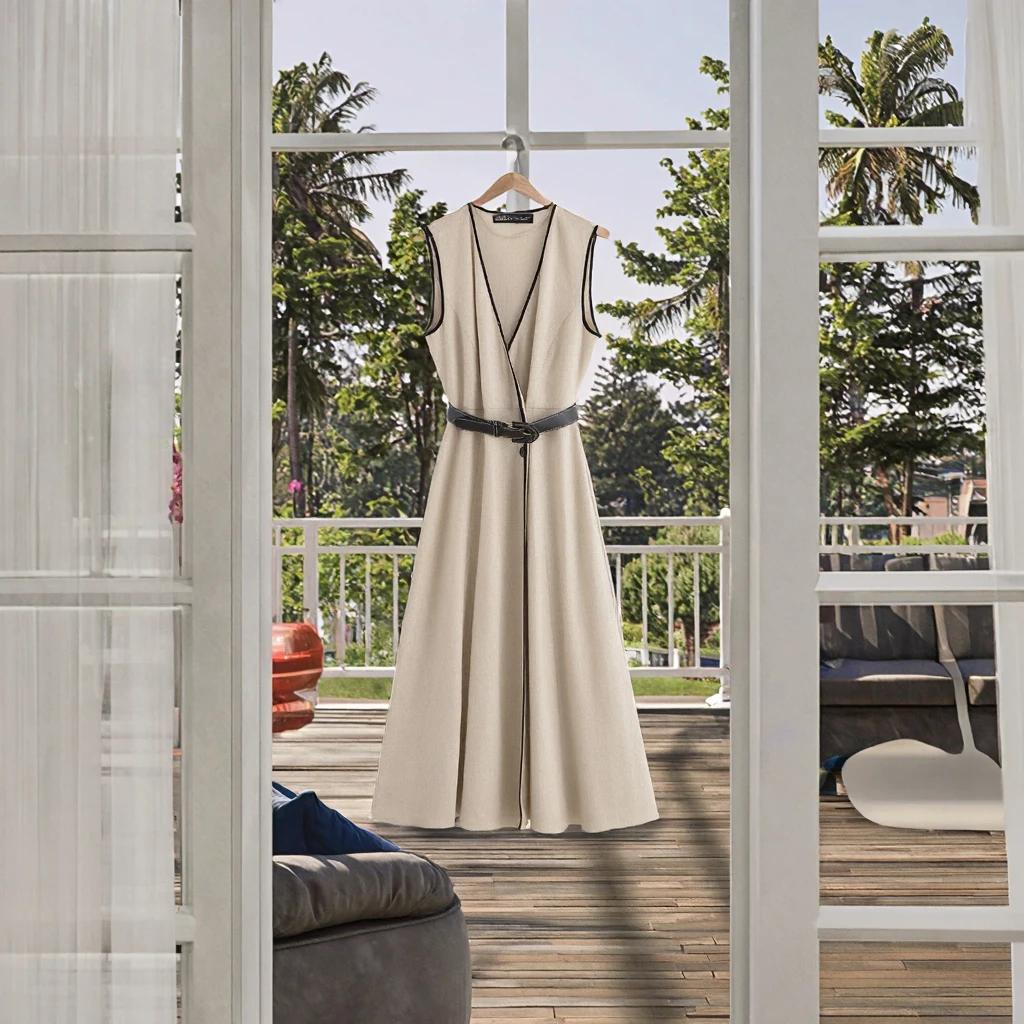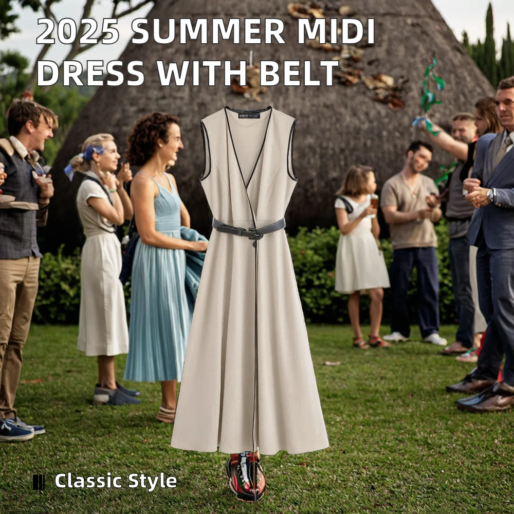 Women's 2025 Summer Vintage Midi Dress Breathable Woven Floral Pattern Free Sleeveless Belt for Casual Day Outfit Vestidos Mujer
