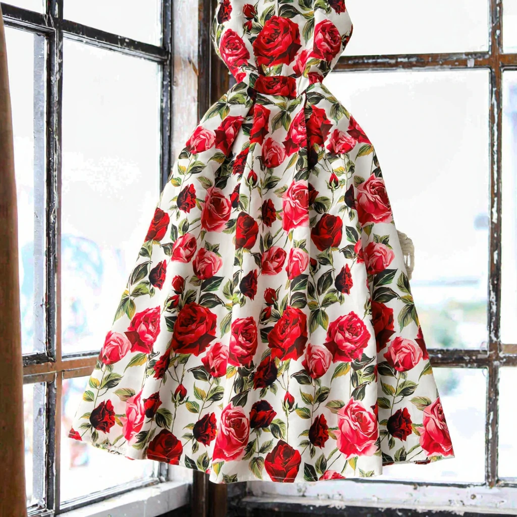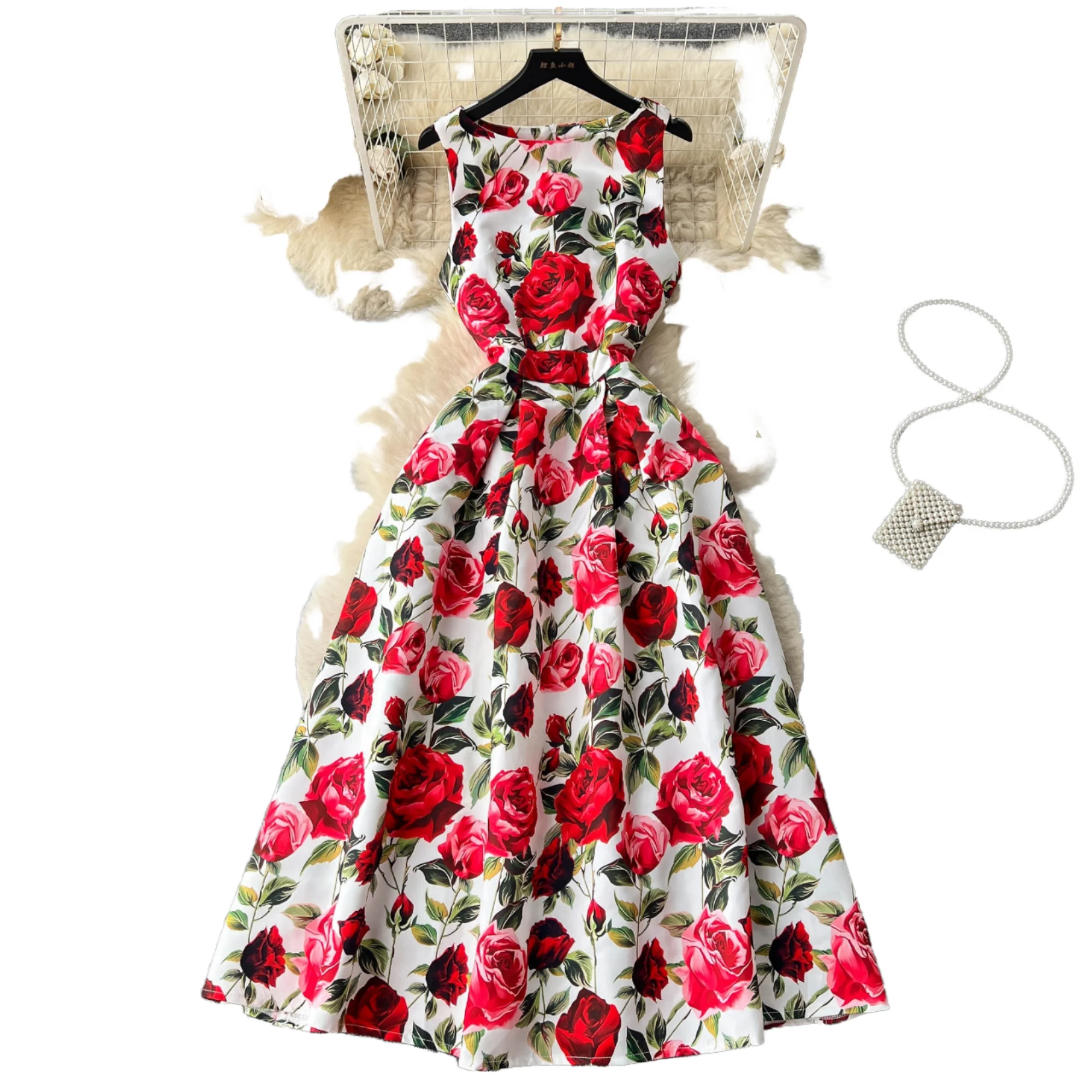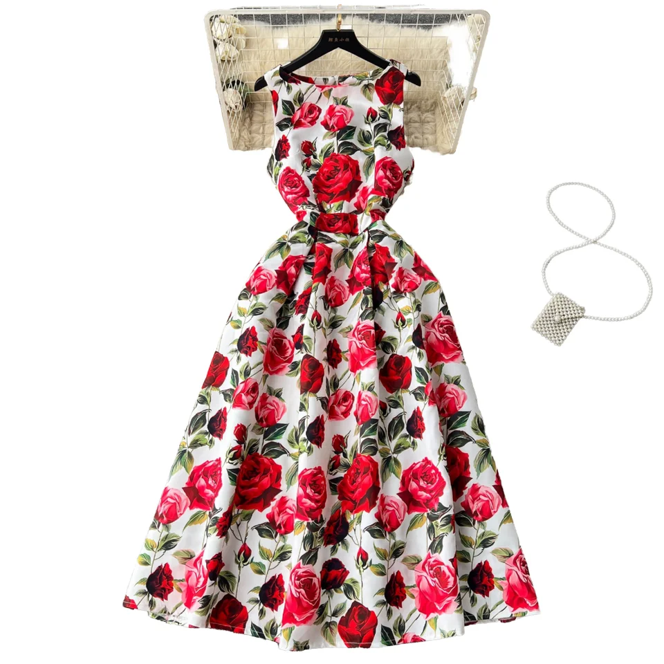 Women's Retro Style Printed Floral Dress Casual Floral A-Line Round Neck Sleeveless Skirt with Empire Waistband for Summer