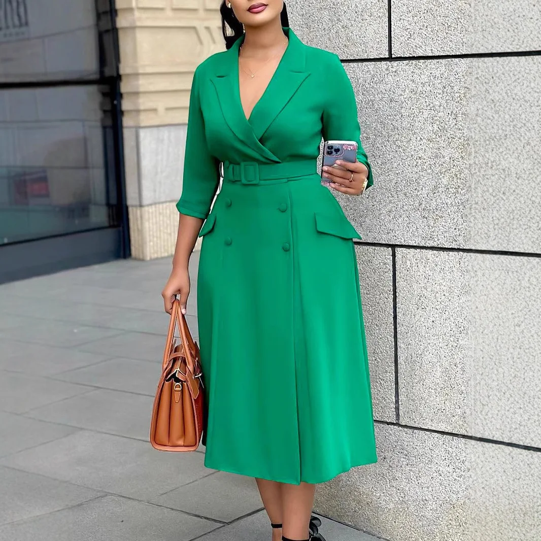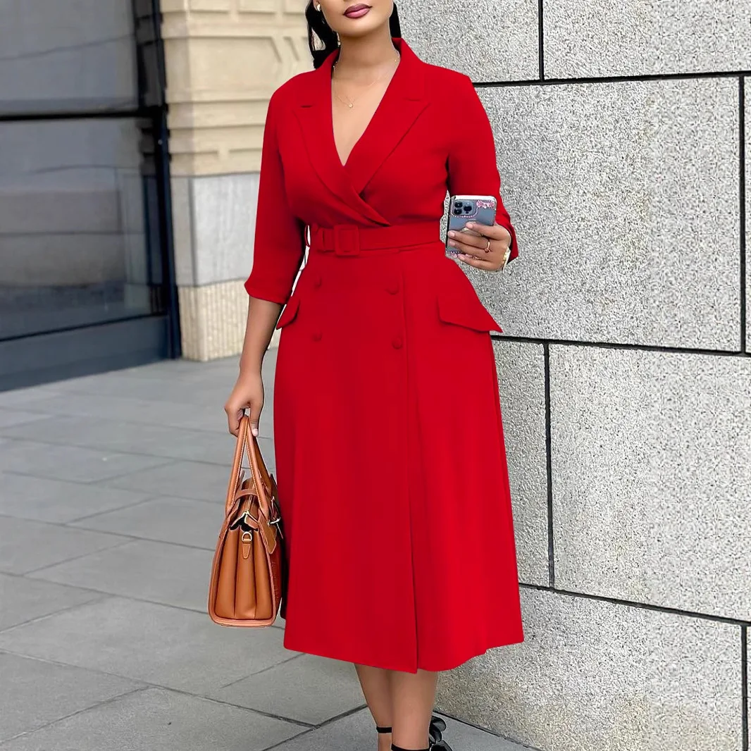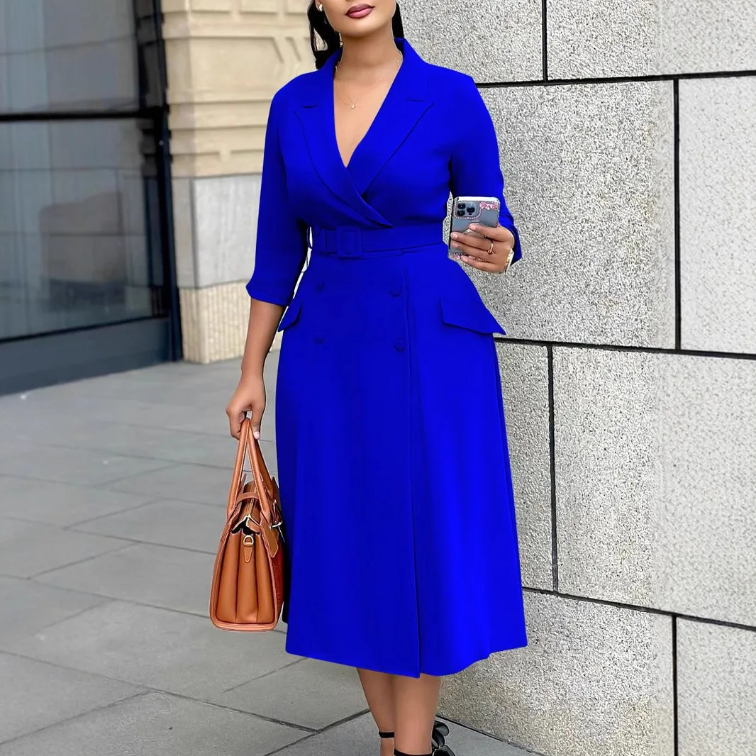 Women's Casual Double-Breasted Blazer Collar Midi Dress Solid Color Fashionable Button for Autumn for Cross-Border Trade