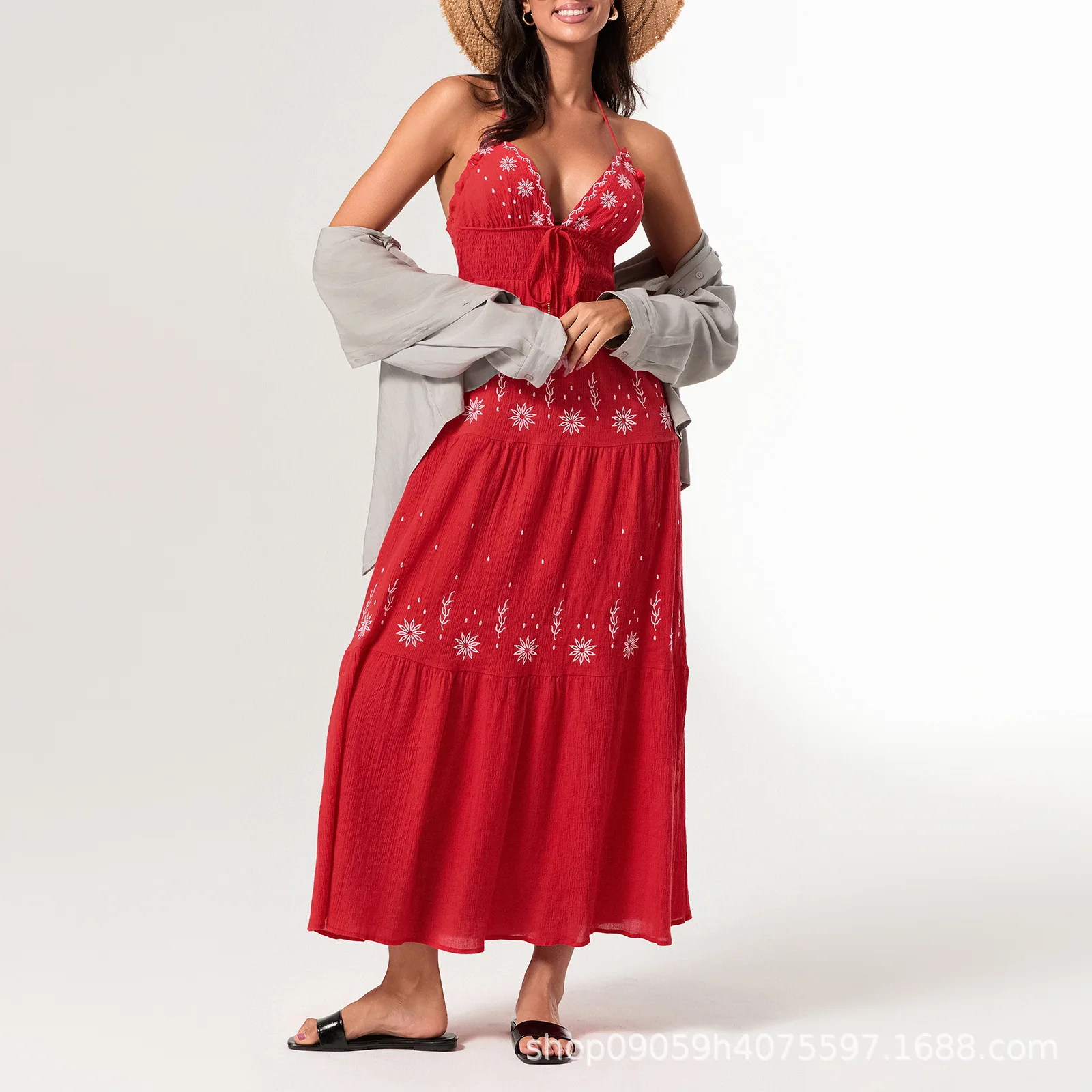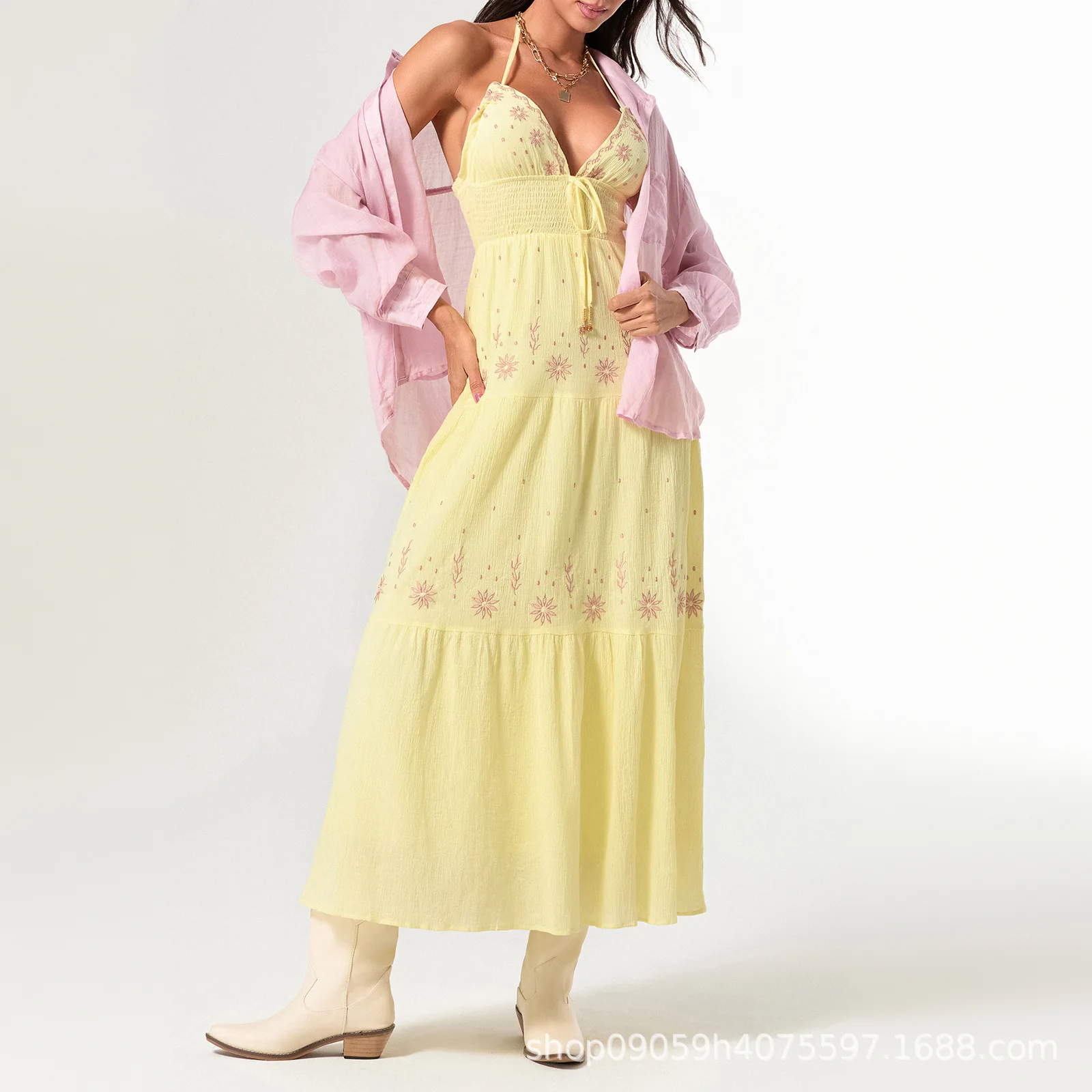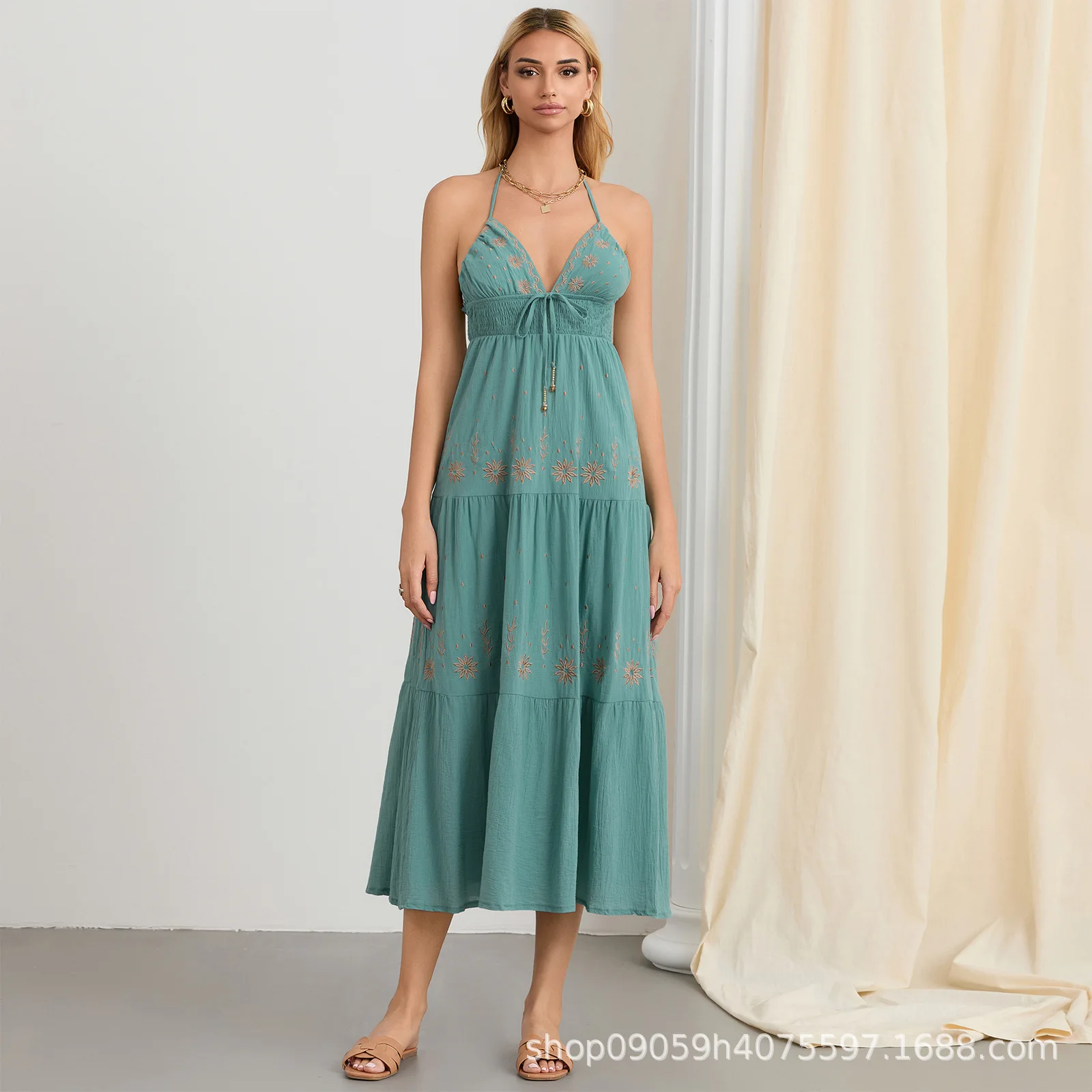 2025 Bohemian Beach Dress Floral Embroidery Backless Sleeveless Dresses Spaghetti Strap for Pool Party Summer Vacations