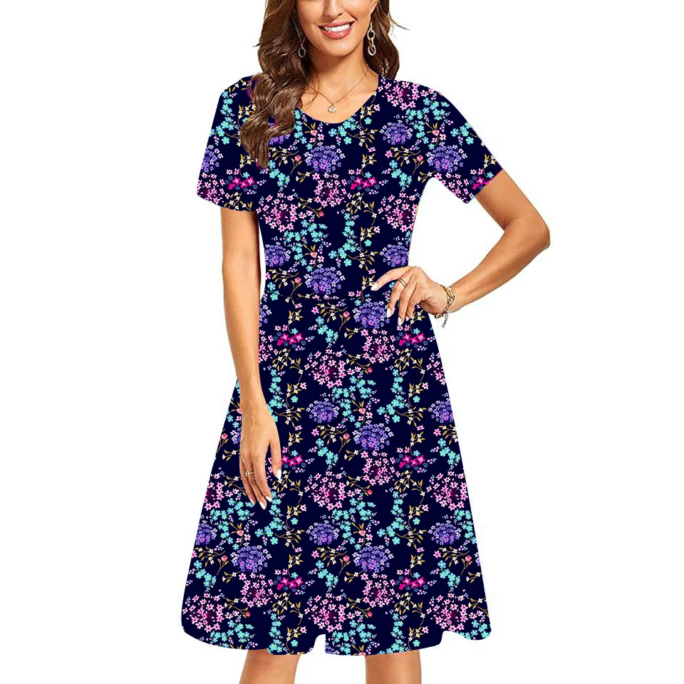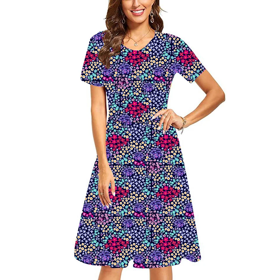 2025 New Bohemian Style Women's Dress Ladies Floral Printed Neck Casual Loose Short Sleeve Crocheted Technique Sweet New Selling