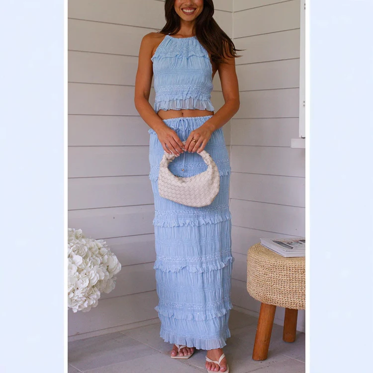 2025 Summer New Sleeveless Chiffon Set Elastic Waist Flowy Midi Casual Skirt Fashion Vest Women's Set Boutique Wholesale