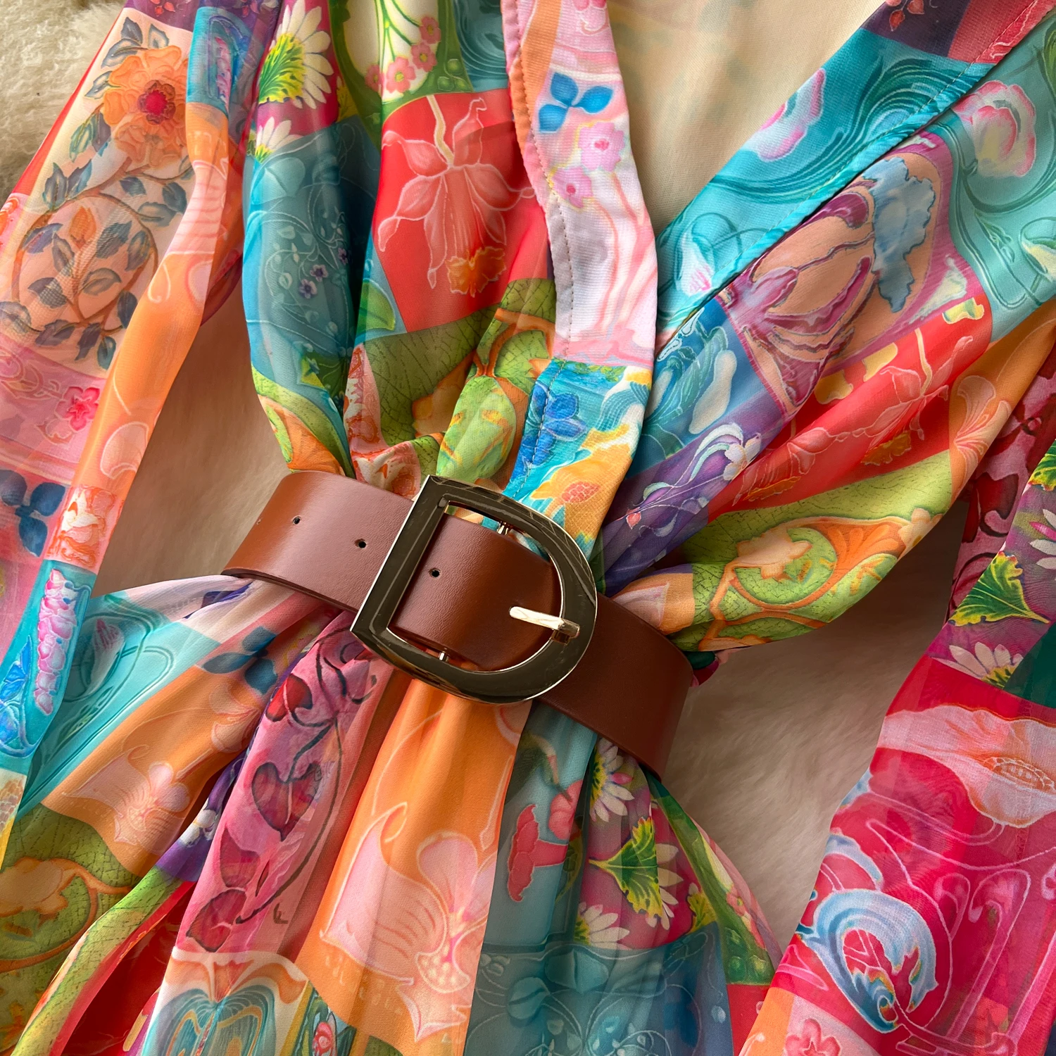 2025 New Maxi Evening Dress Chiffon Printed V-Neck Ethnic Gown Party Robe Belt Evening Dress European American Style