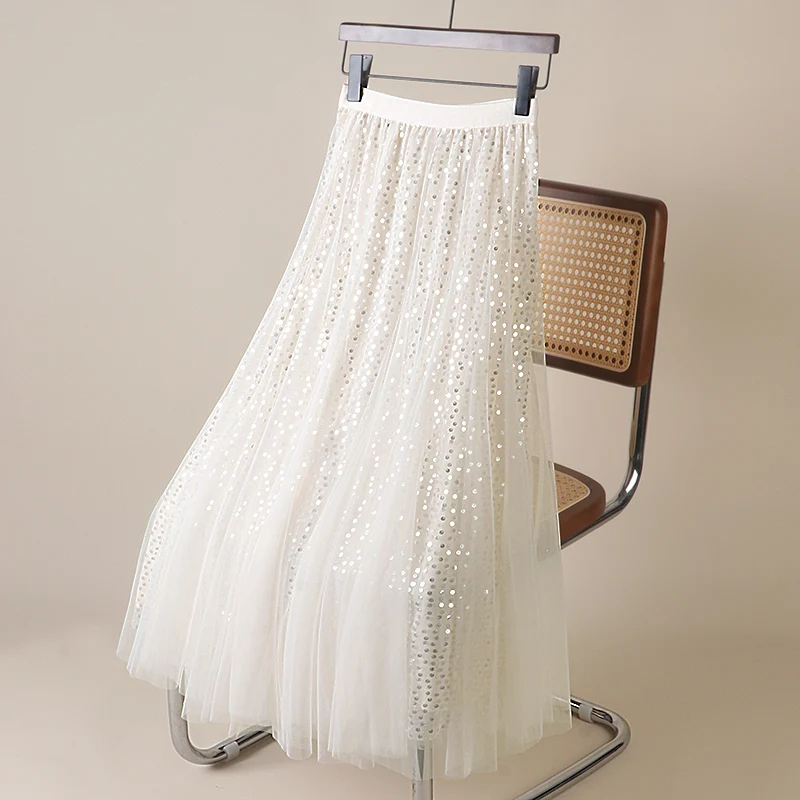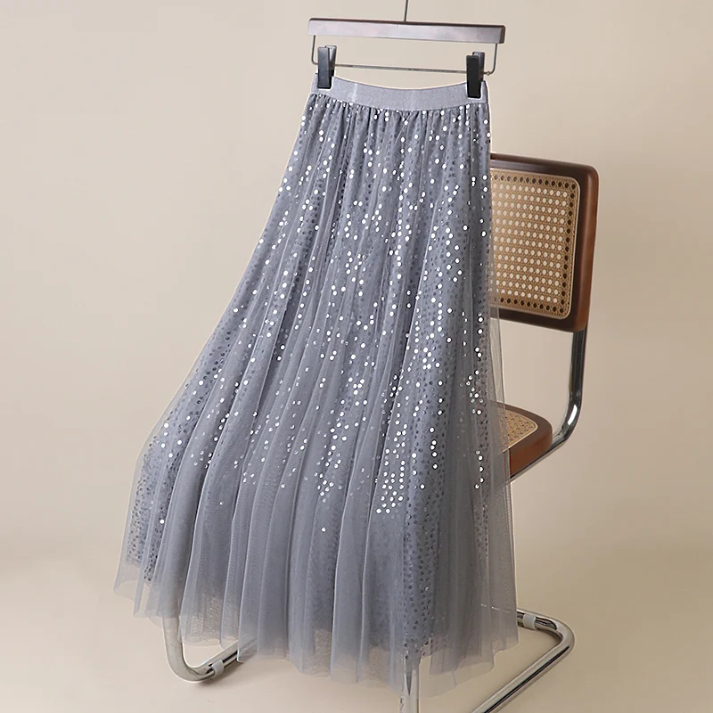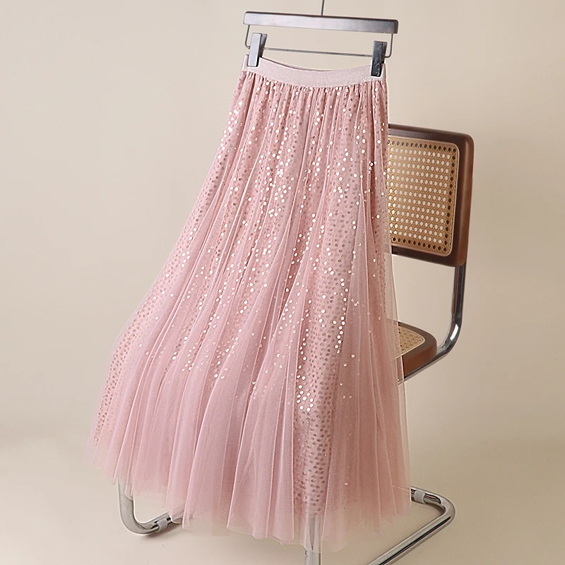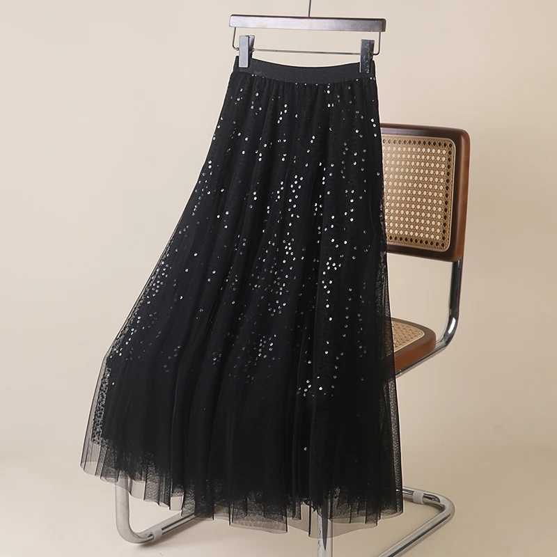 Elegant Luxury French Style Sequin Midi Skirt Mesh Pleated High Waisted Solid Color Skirt for Evening Party