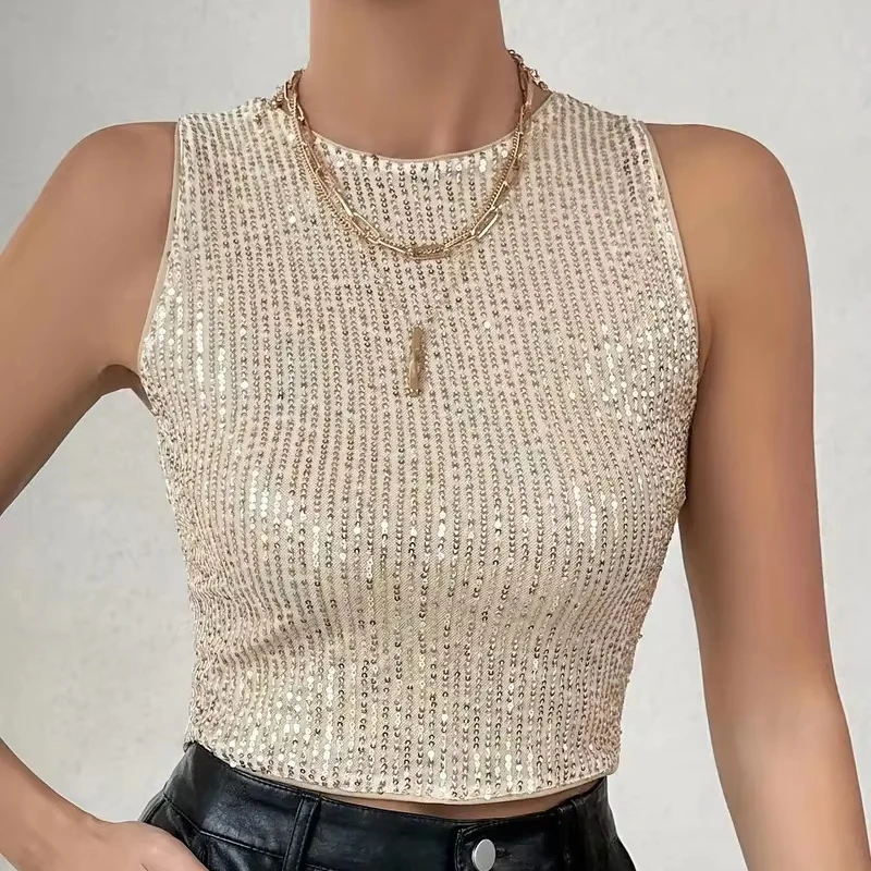 2025 New Summer Sequined Tank Top Solid Color Sleeveless Slim Vest Women's Fashionable Casual Small T-Shirt