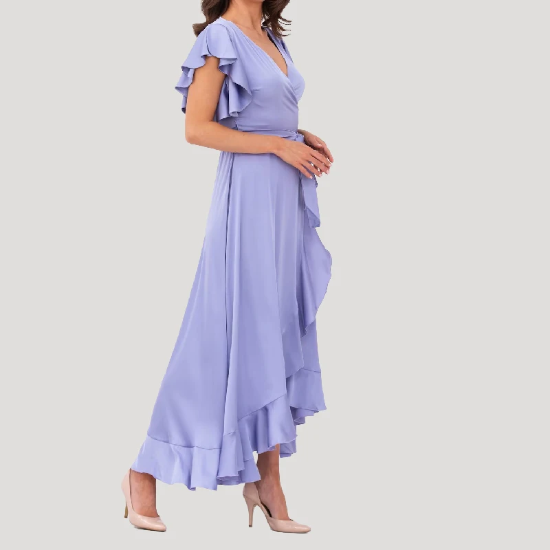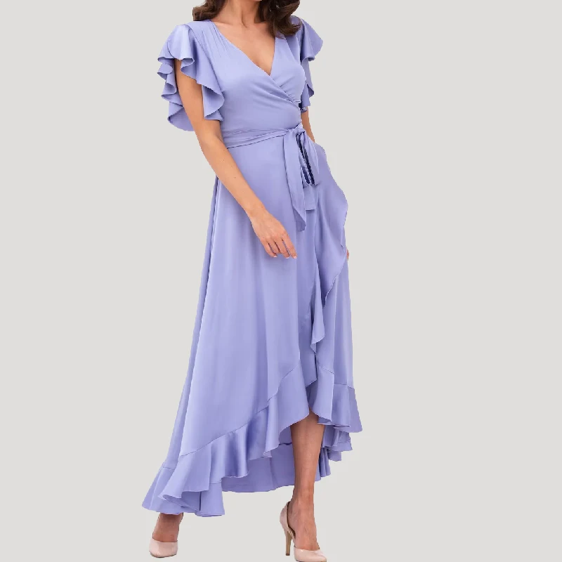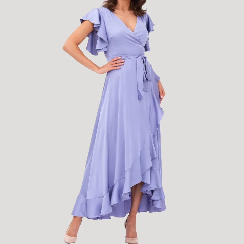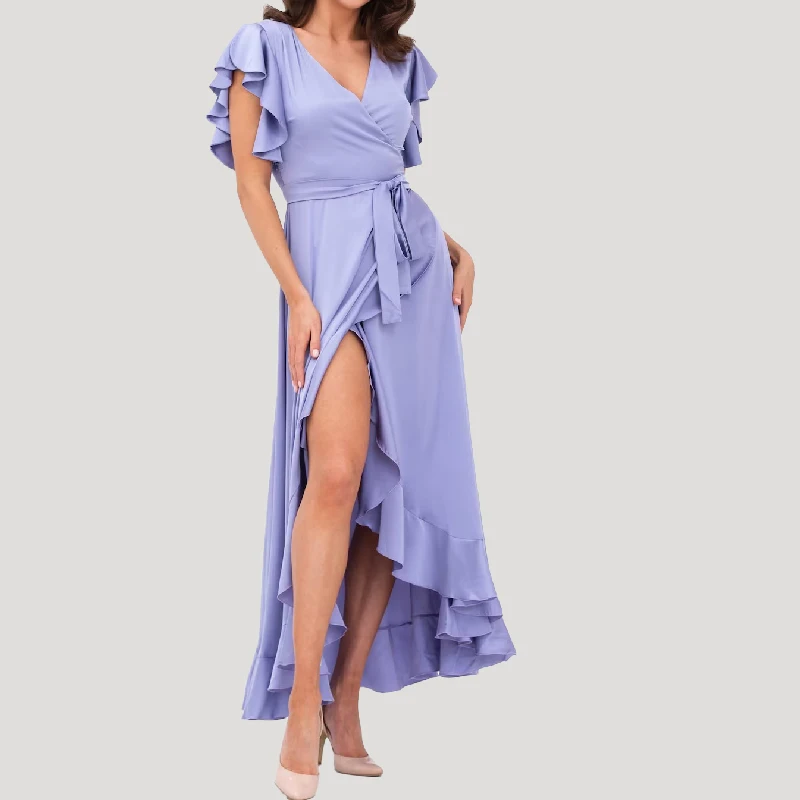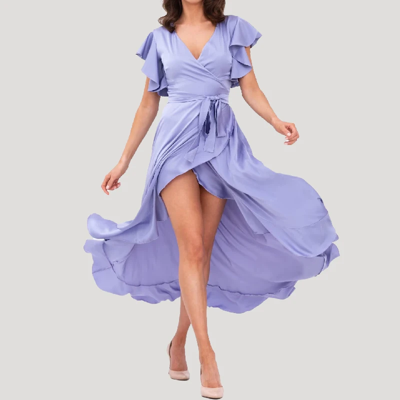 Lavender V-neck Ruffle Luxe Satin Midi Length Wrap Tie Bridesmaid Dress One Size