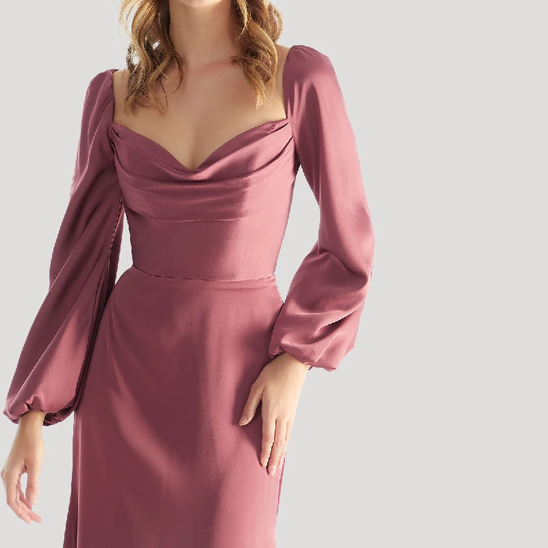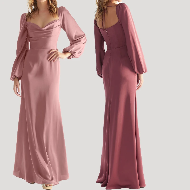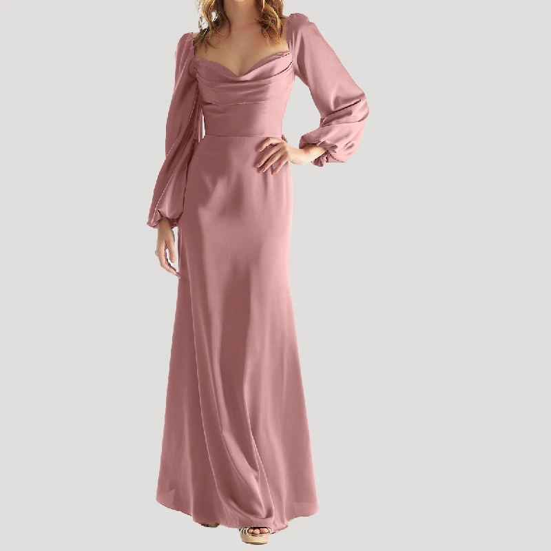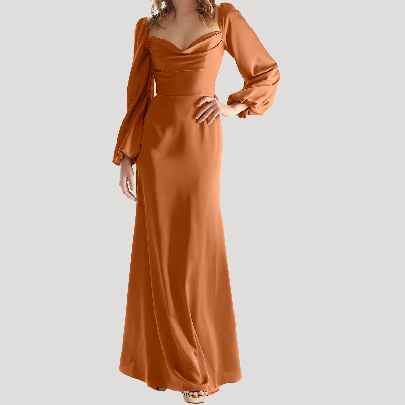 Peach Color Long Sleeve Sweetheart Neckline Satin Bustier Maxi Bridesmaid Dresses 2026