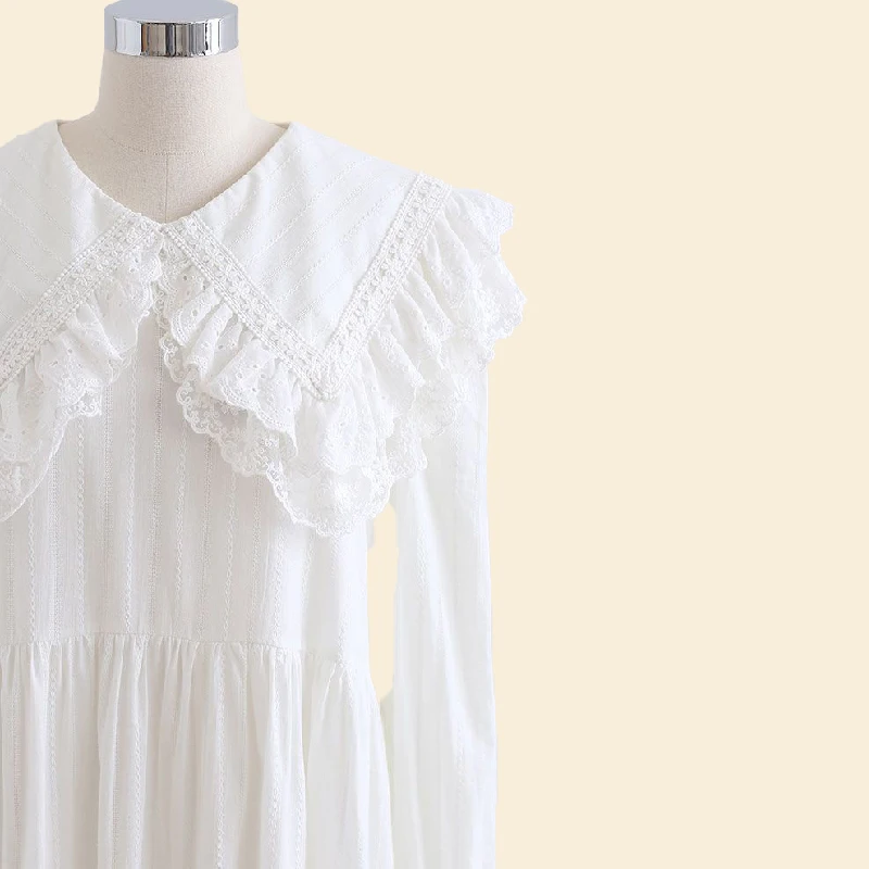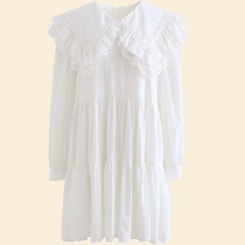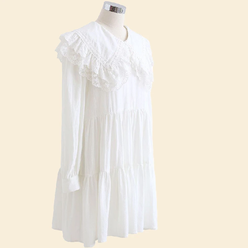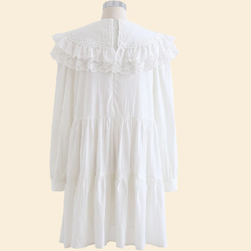 Wholesale Clothing Manufacturer 100% Cotton Long Sleeve Peter Pan Collar Embroidered Mini Dolly Dress in White for Women