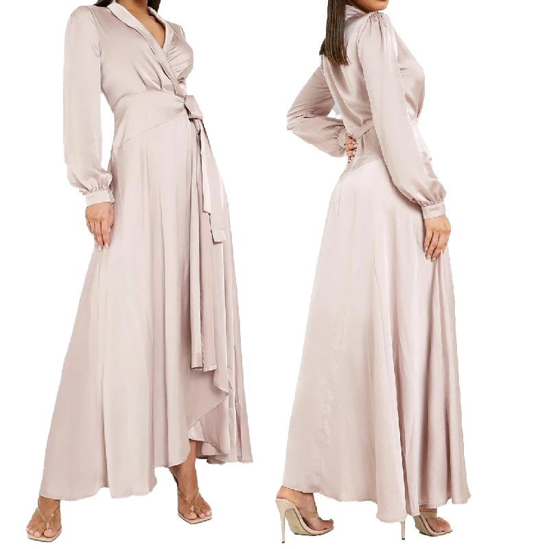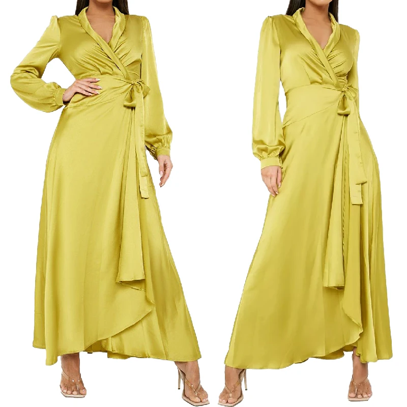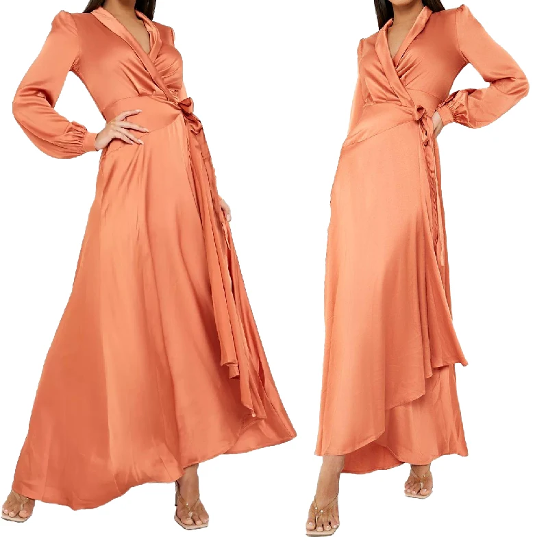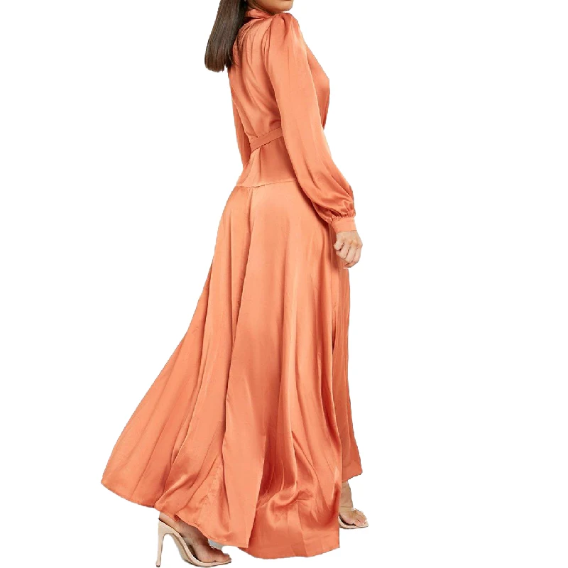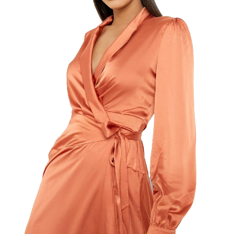 Latest Rust Color Long Puff Sleeve V-neck Satin Wrap Belted Maxi Elegant Wedding Bridesmaid Dresses