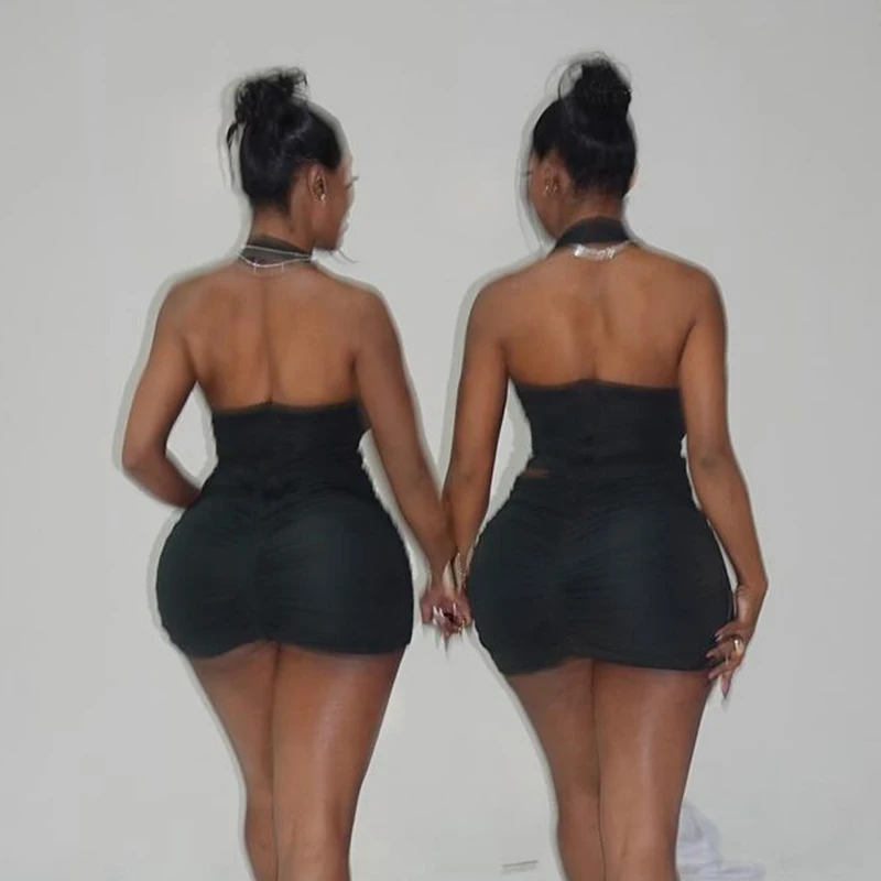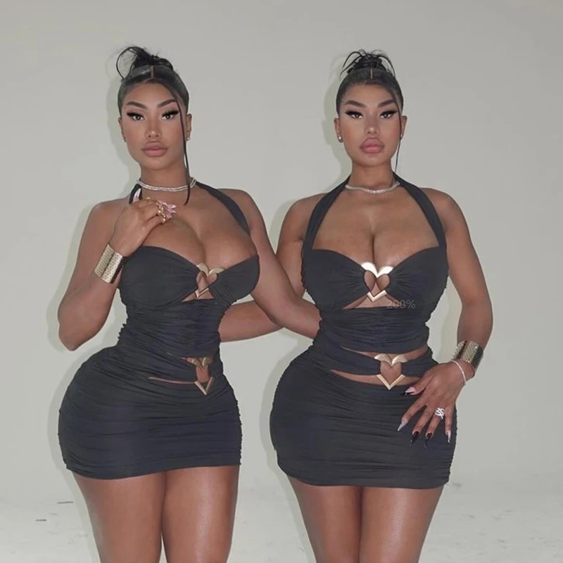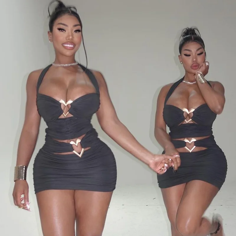 Halter neck low bust sleeveless heart metal buckle cut-out ruched sissy black micro mini sexy dresses