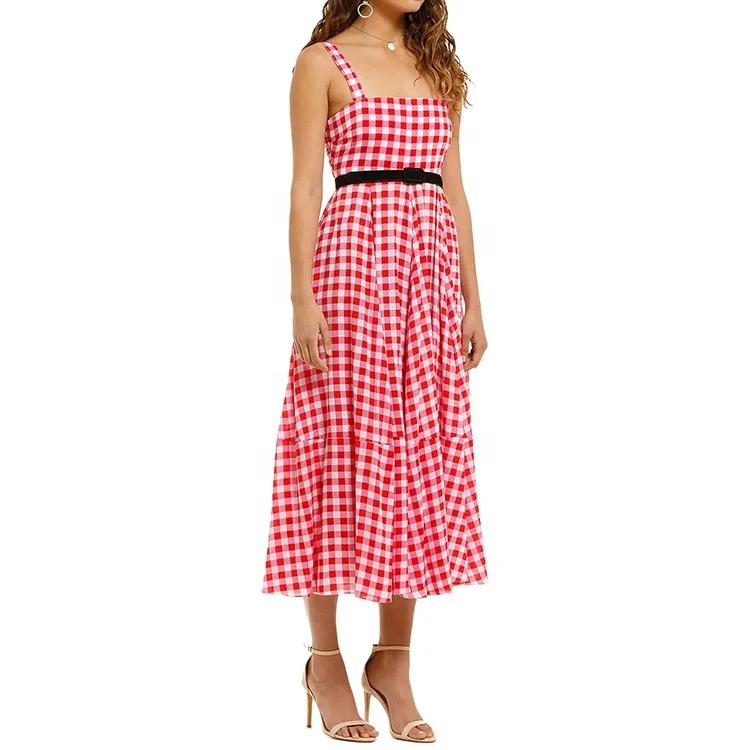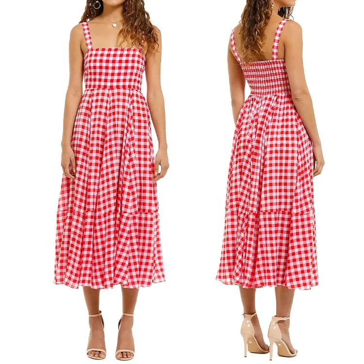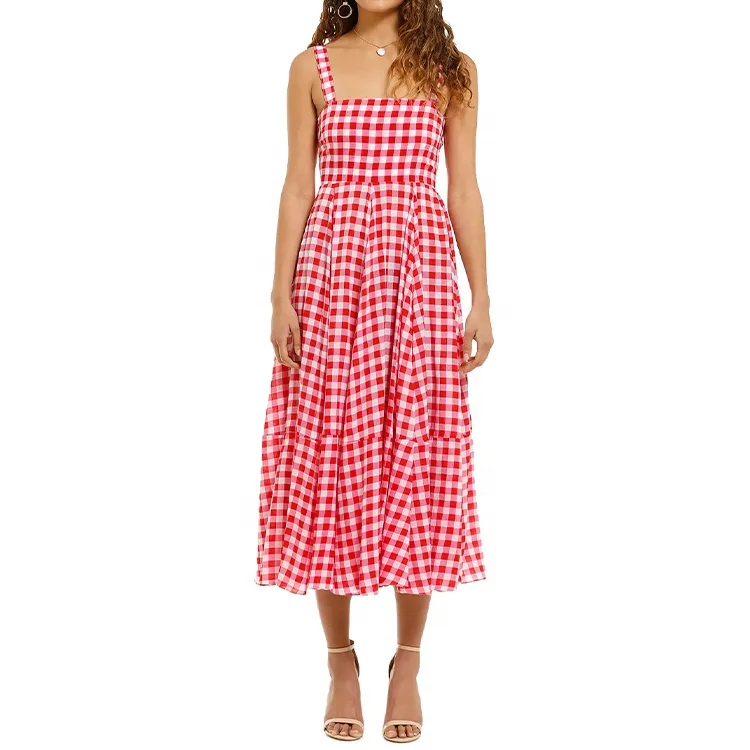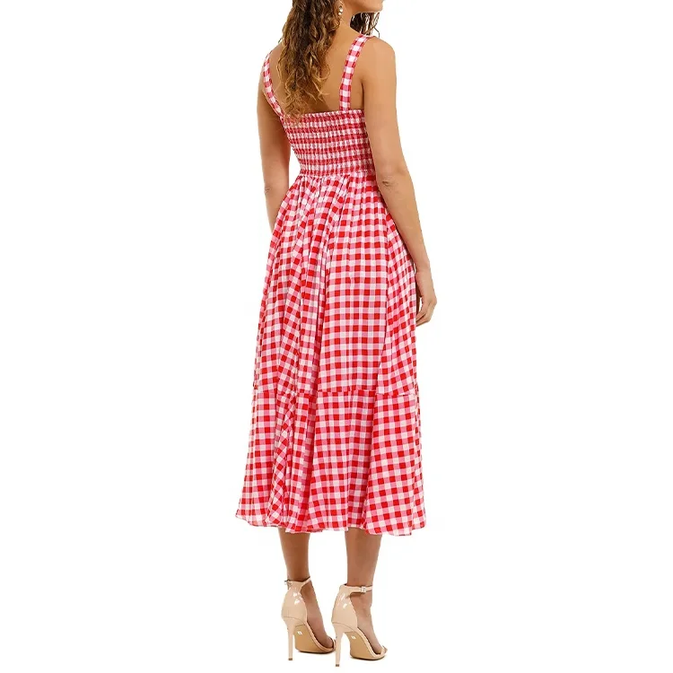 Vintage Elegant Summer Casual square Neck Sleeveless Elastic Bodies Plaid Gingham Midi Sundress Women Dress 2025