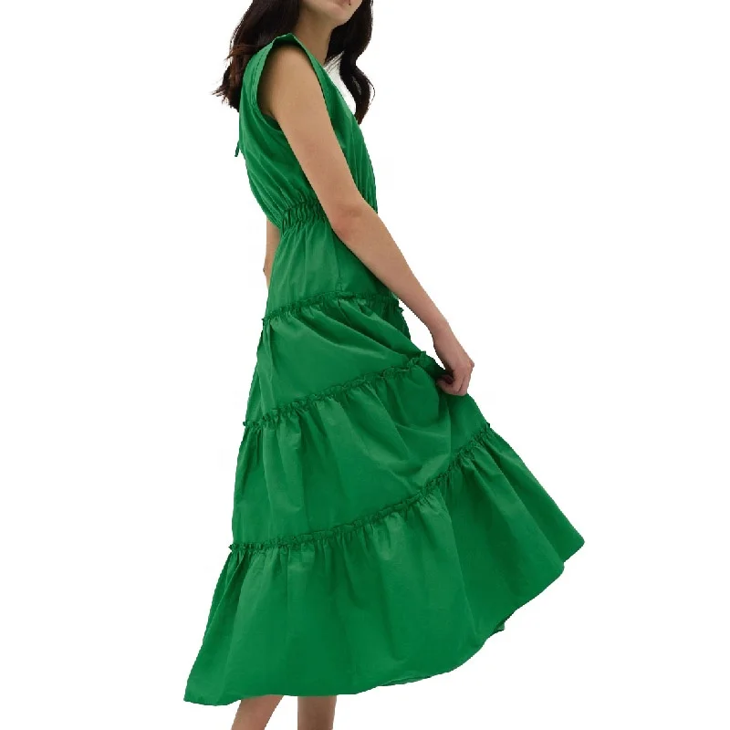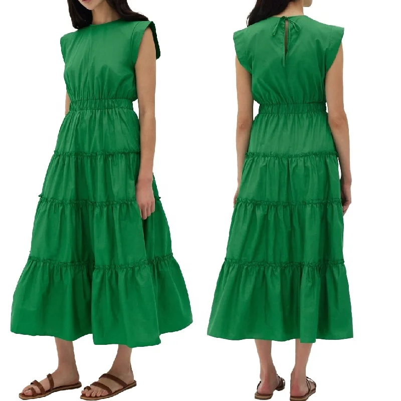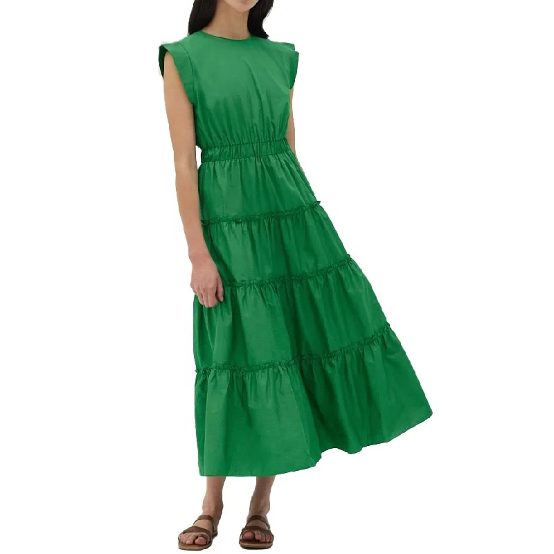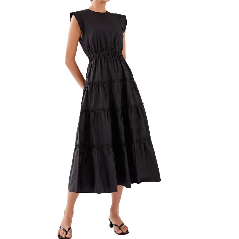 Wholesale Elegant Casual Summer Sleeveless Round Neck Elastic Waist Tiered Cotton Maxi Dresses