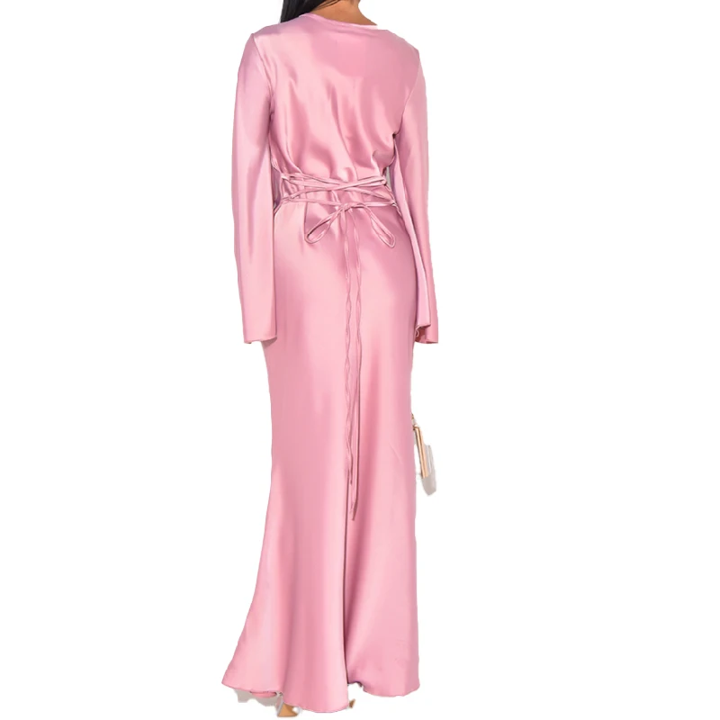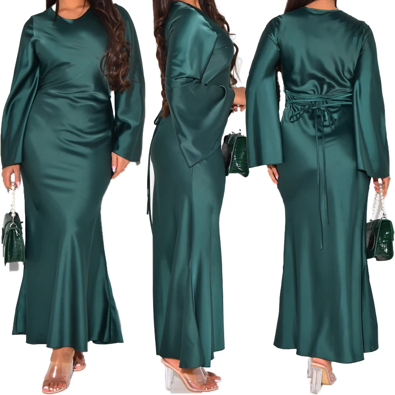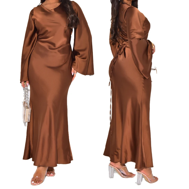2025 Elegant Simple Long Lantern Sleeve Round Neck Maxi Mermaid Skirt Muslim Modern Satin Dress Design From Dubai