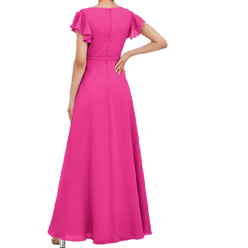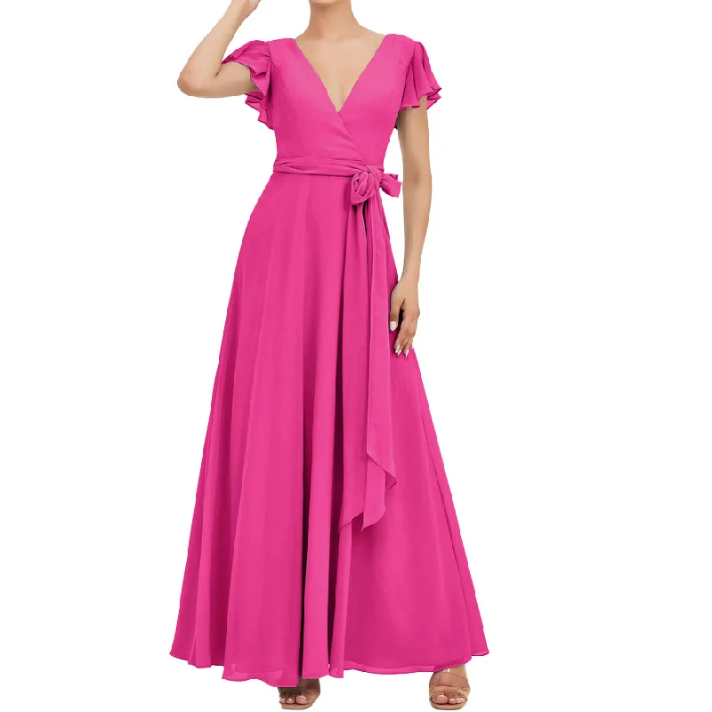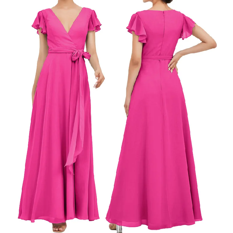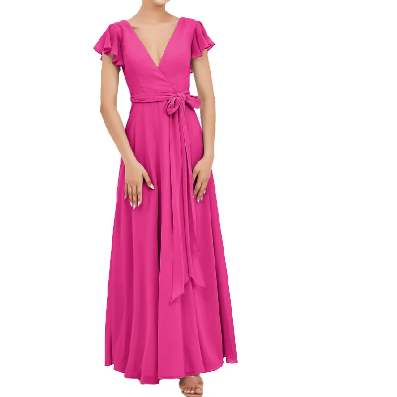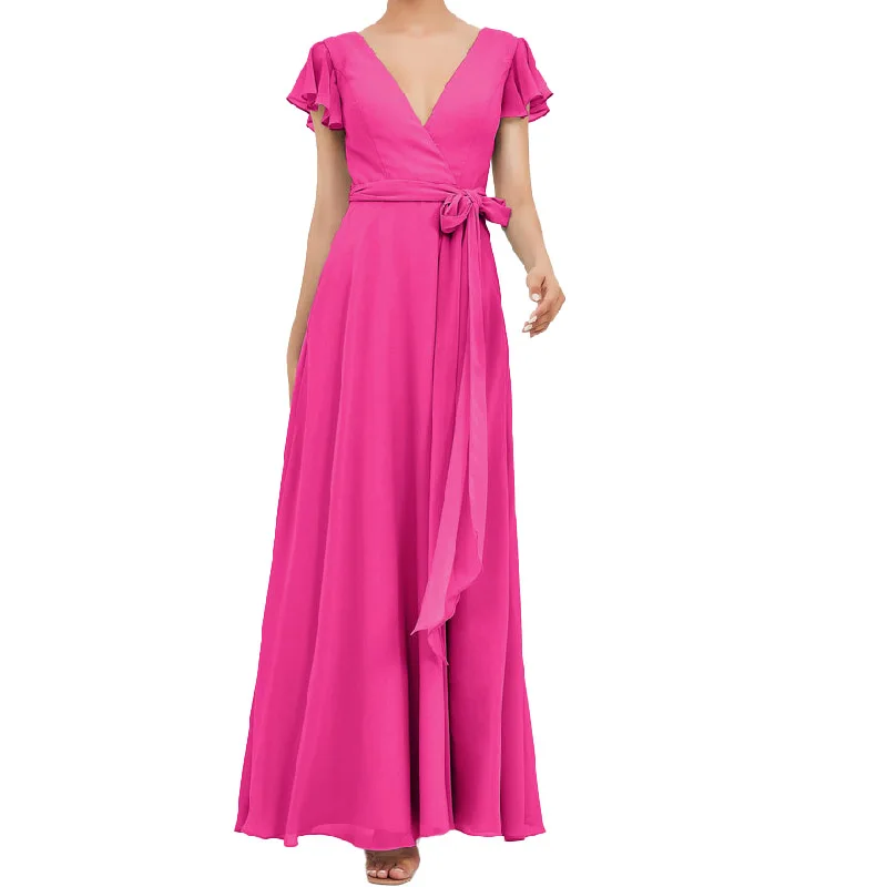 Elegant Flutter Sleeve V-neck Wrap Chiffon Long Gown Bridesmaid Dresses