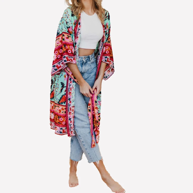 Ethnic Women Summer Shirt Blouse Ladies Printed Long Blusas Tops Plus Size Hippie Floral Chiffon Boho Kimono Cardigan