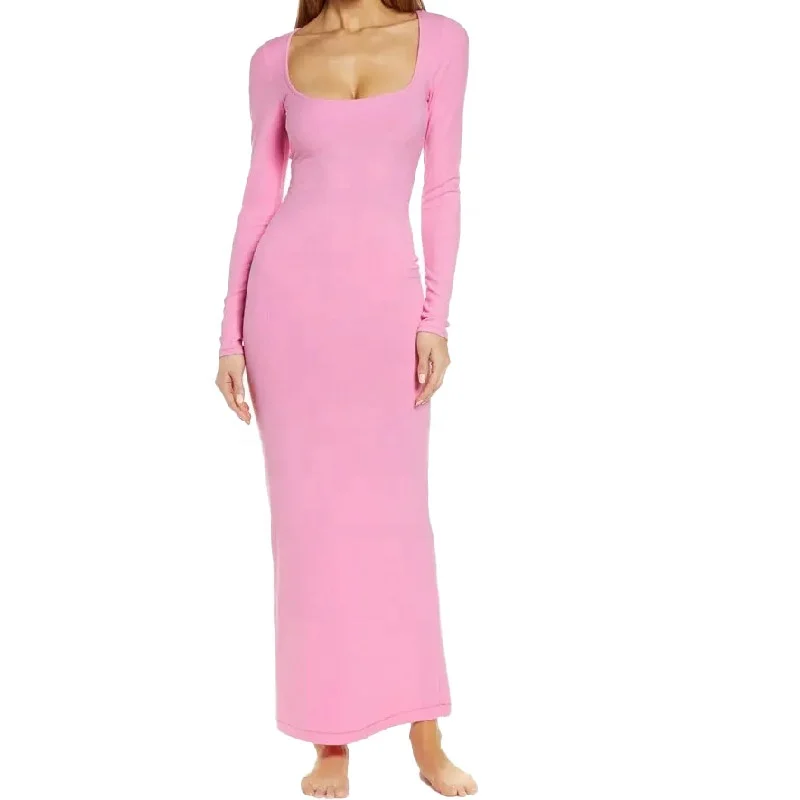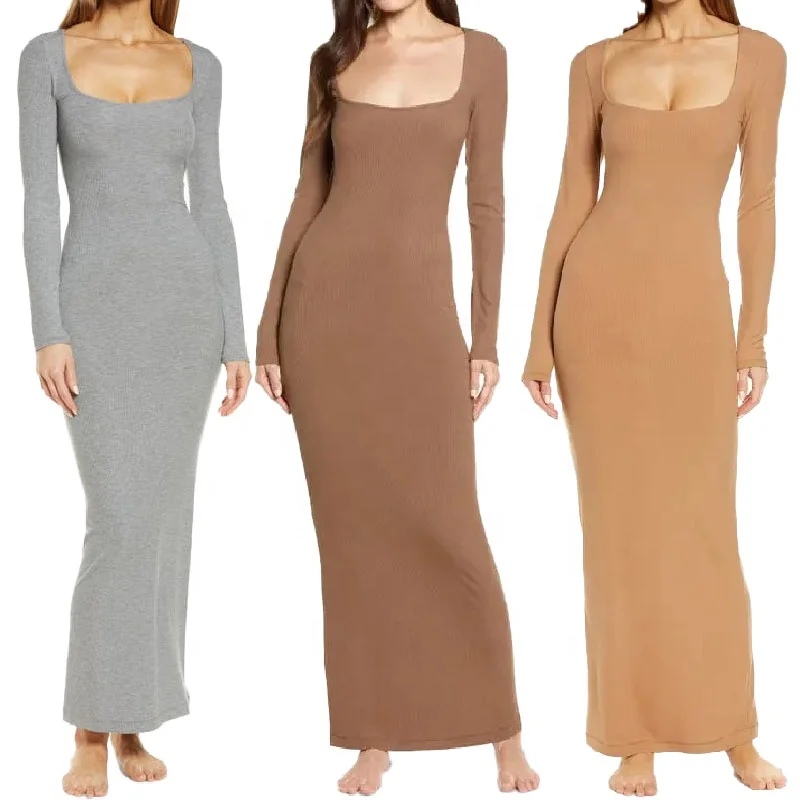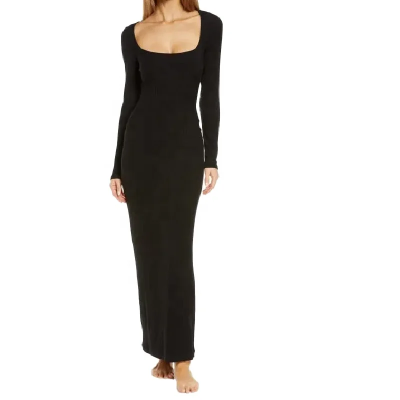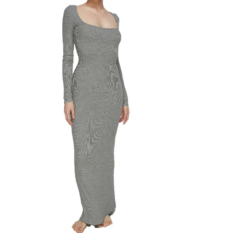 Wholesale Winter Autumn Casual Long Sleeve square Neck Sexy Tight Basic Ribbed Maxi Dresses