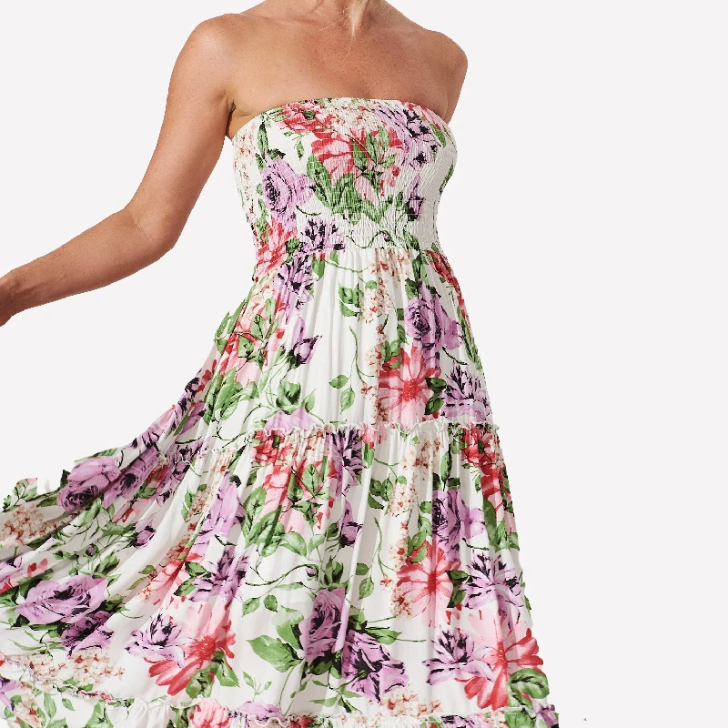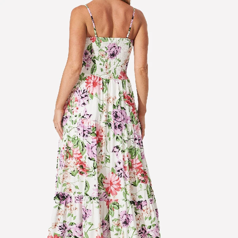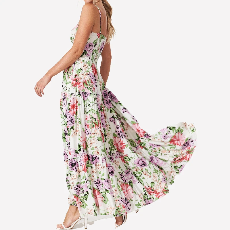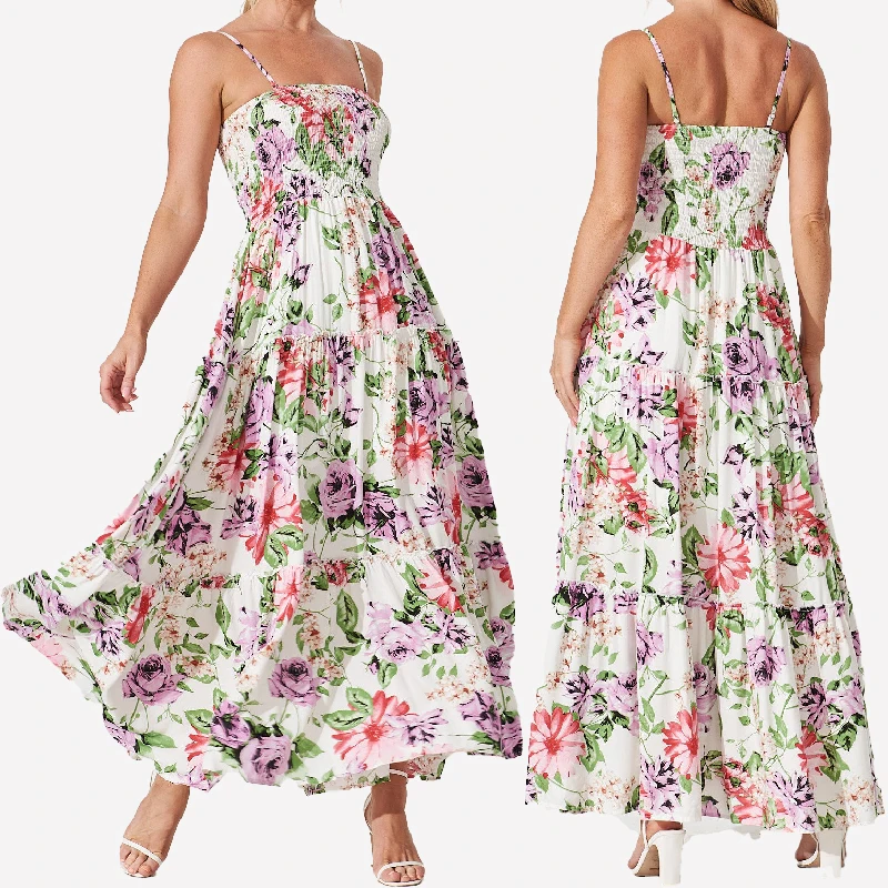 Elegant Summer 100% Viscose Removable Spaghetti Straps Smocked Tiered One Size Floral Printed Long Bridesmaid Dresses