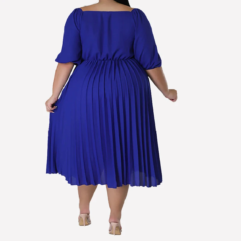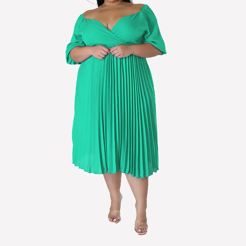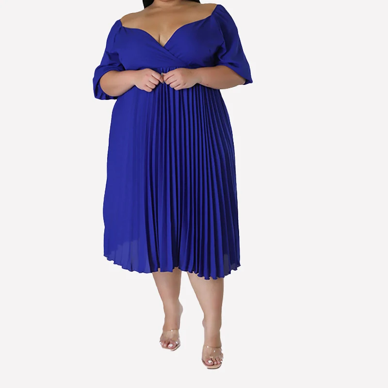 Off the Shoulder V-neck Curve Pleated Bodice Puff Sleeve Chiffon Pleat Plus Size Midi Dress for Fat Women Party