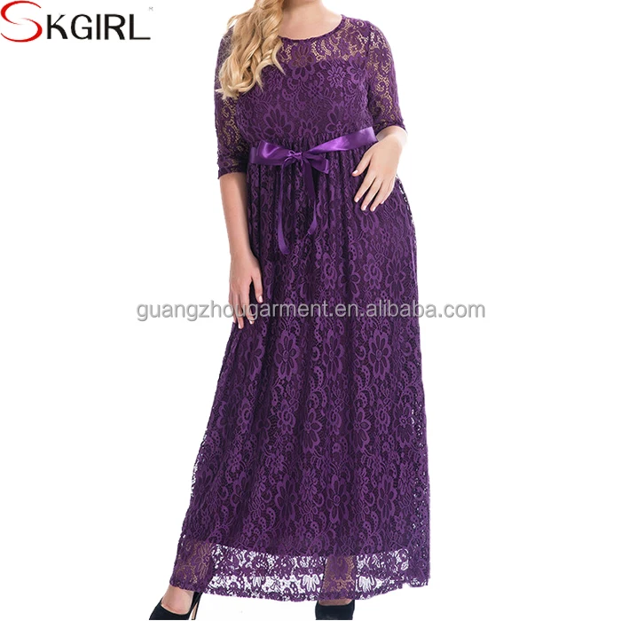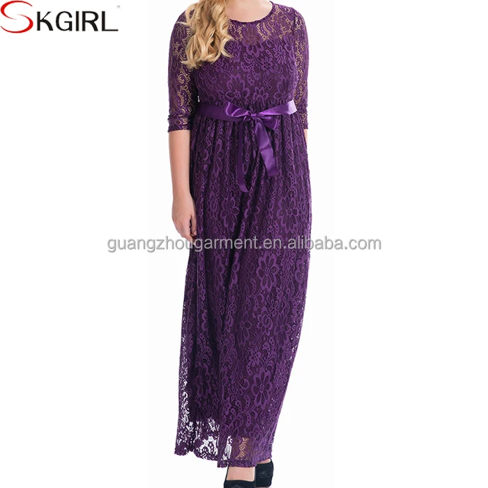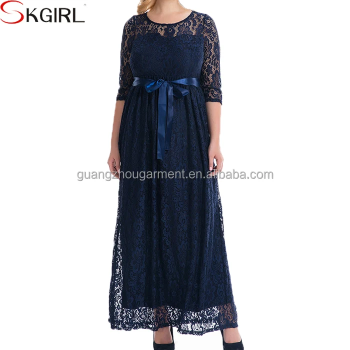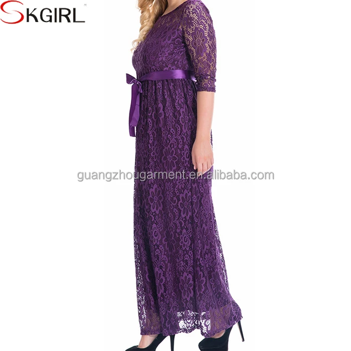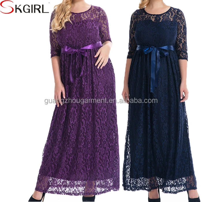 Elegant Women High Quality O-neck Belted Long Sleeve Lace Maxi Party Evening Dress Pictures of Latest Gowns Plus Size Designs