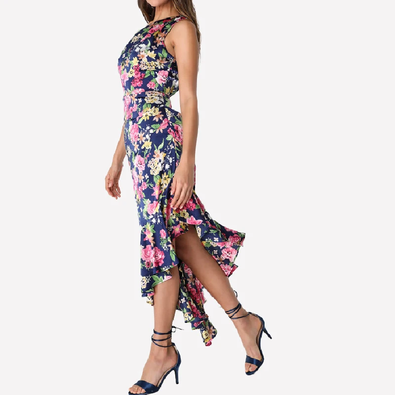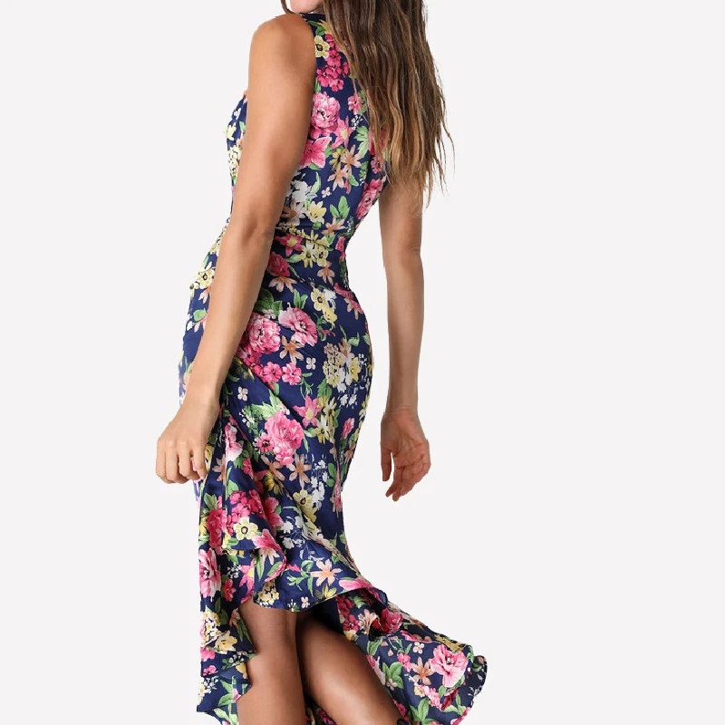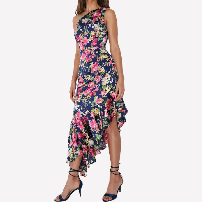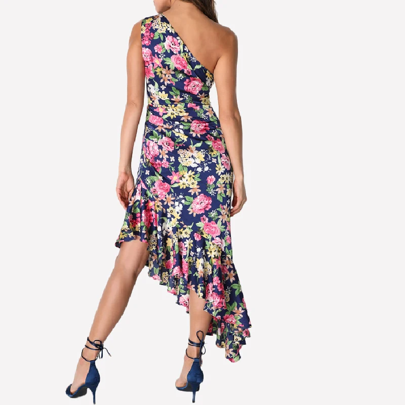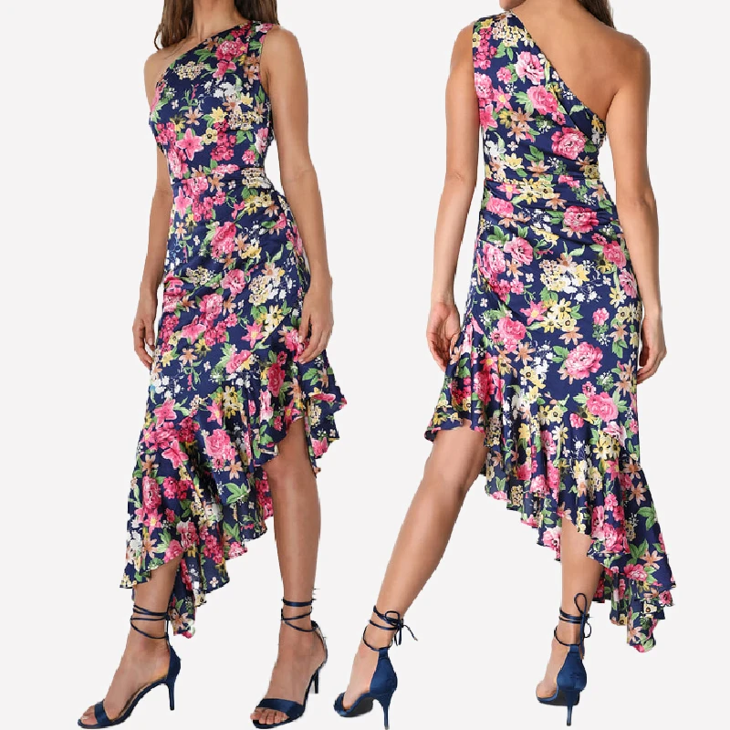 Elegant Mature Women One Shoulder Printed Floral Satin Ruffled Irregular Hem Bridesmaid Dresses 2024