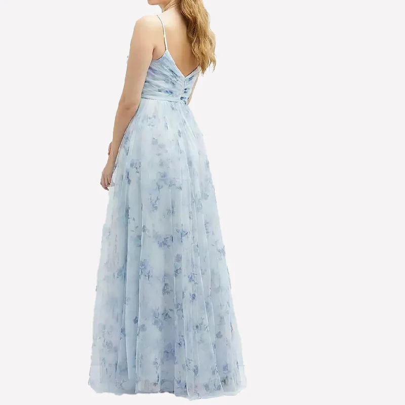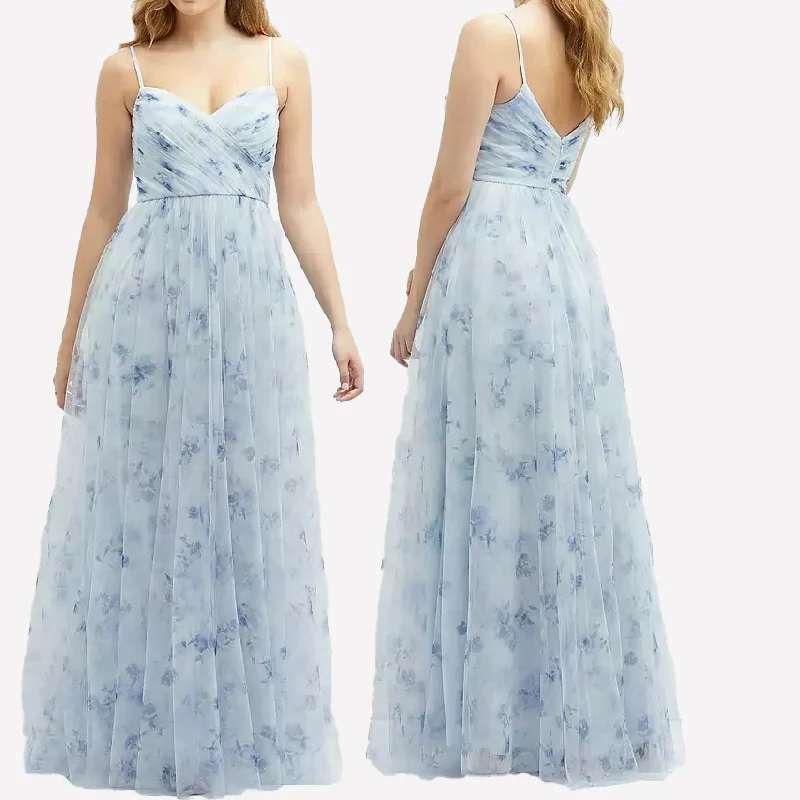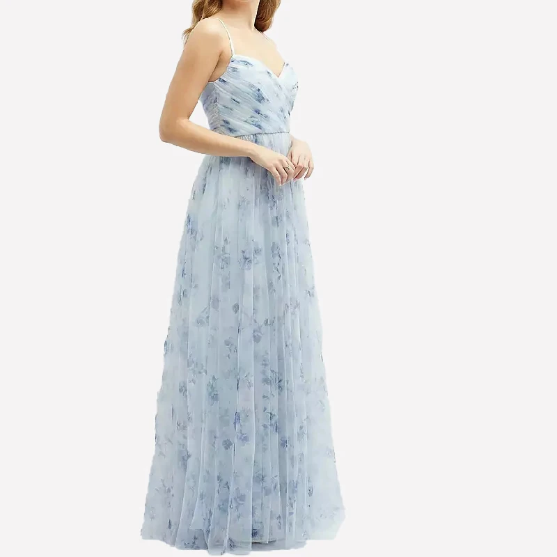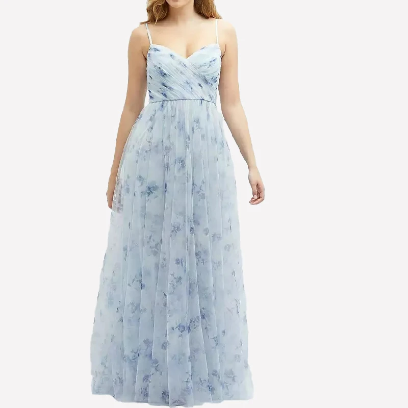 Spaghetti Straps Pleated Ruched Wrap Bodice Floral Tulle Bridesmaid Dress with Long Full Skirt