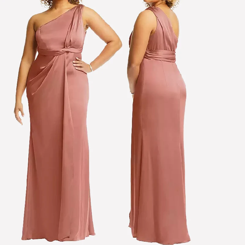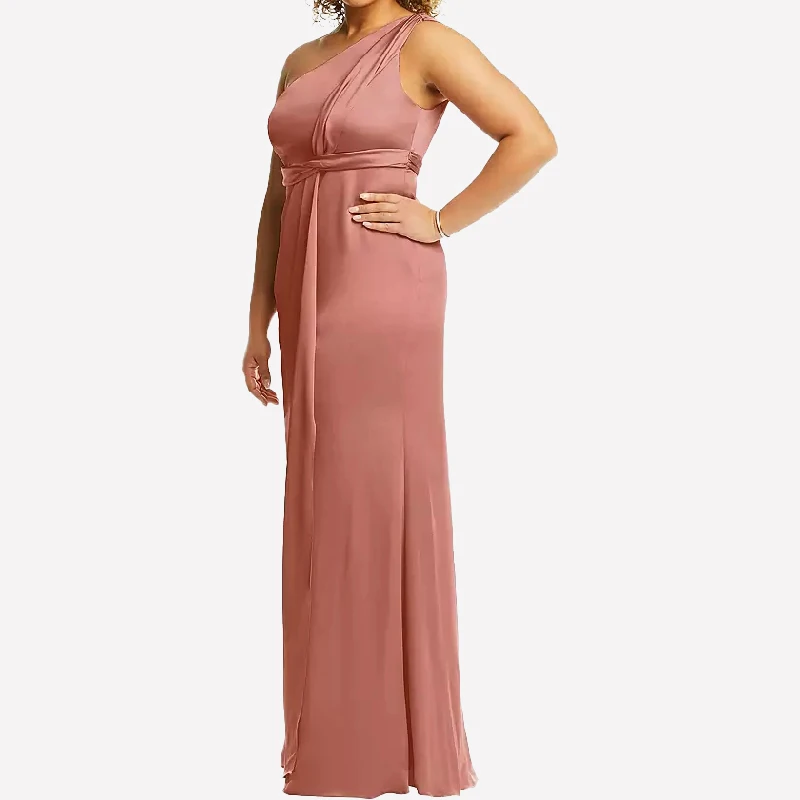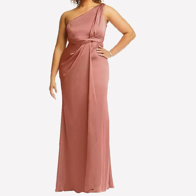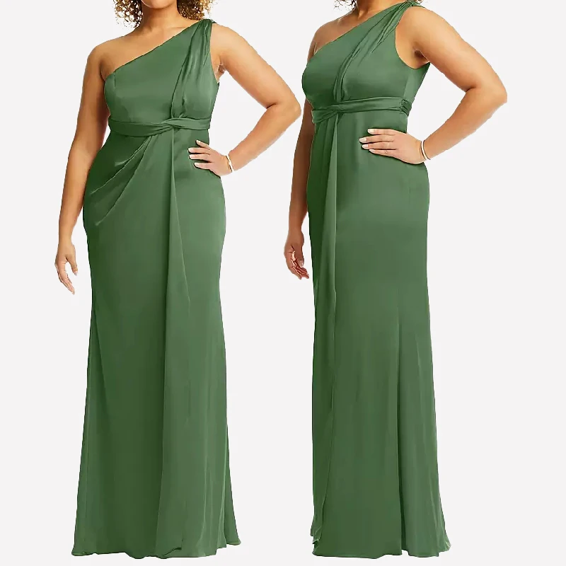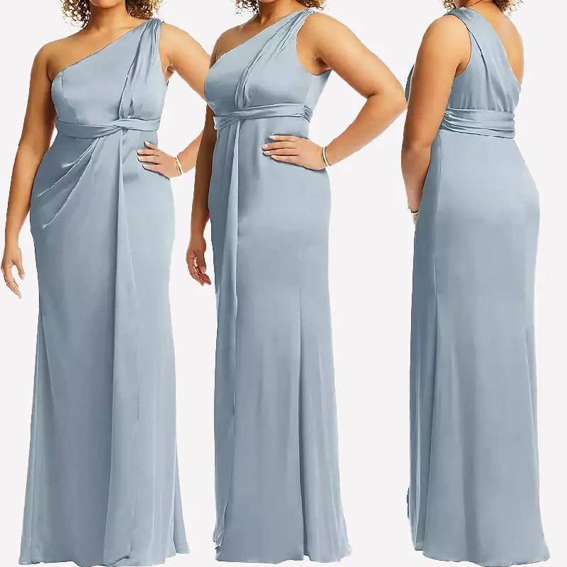 Elegant Dusky Blue One Shoulder Draped Twist Front Long Satin Bridesmaid Dresses