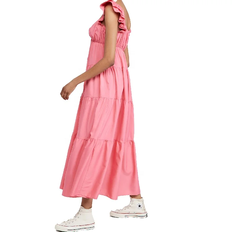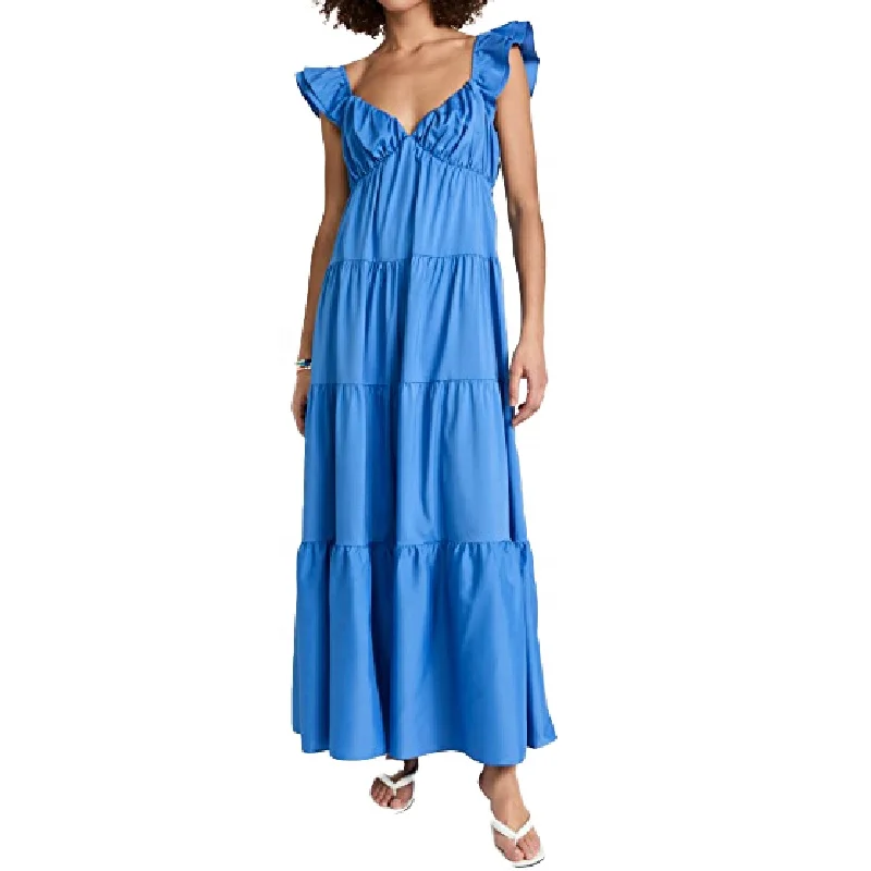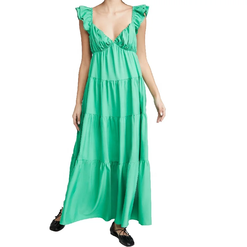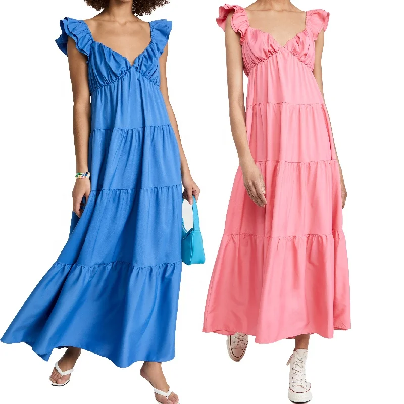 Elegant Casual Summer Ruffle Sleeve V-neck Tiered Plus Size Cotton Long Maxi Beach Dresses