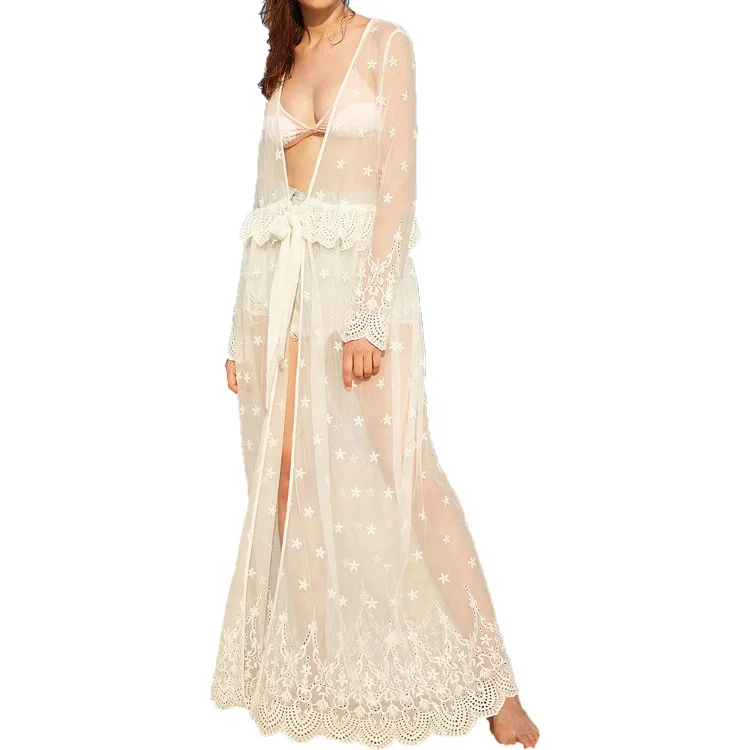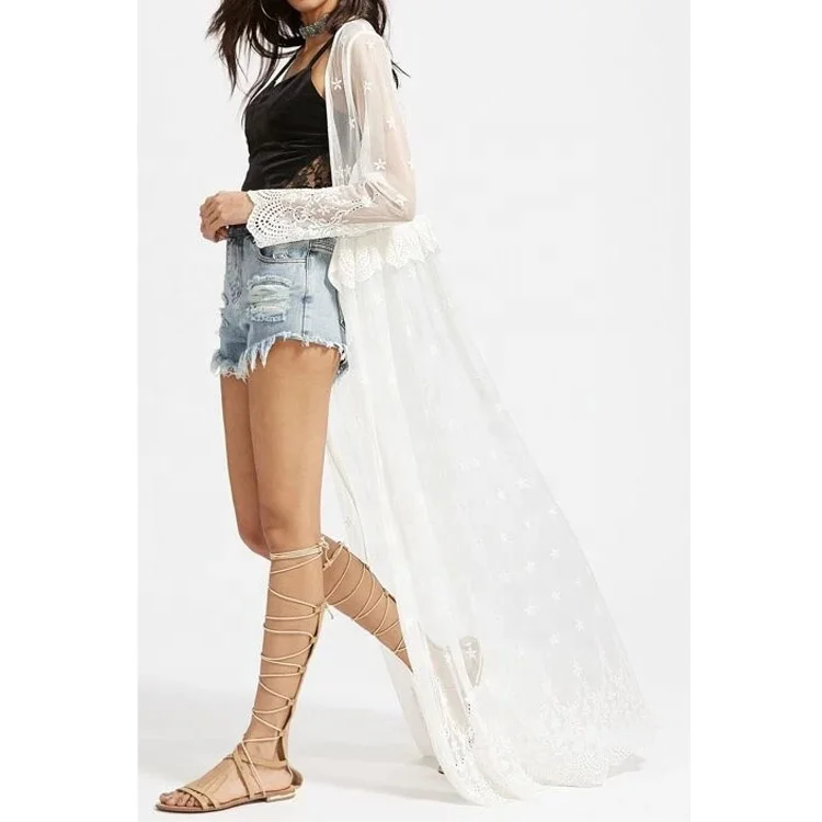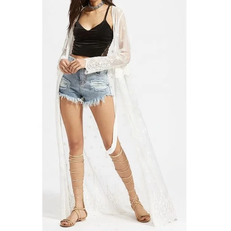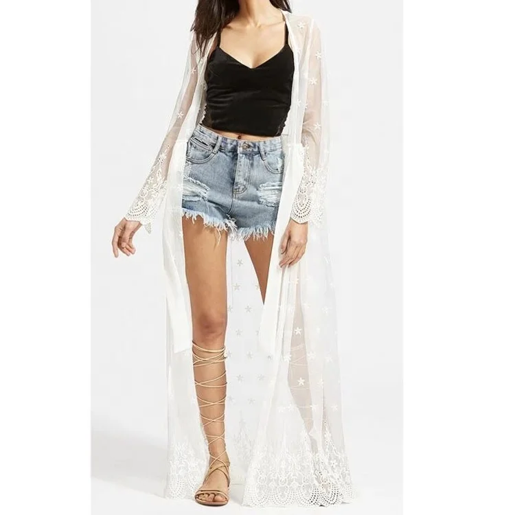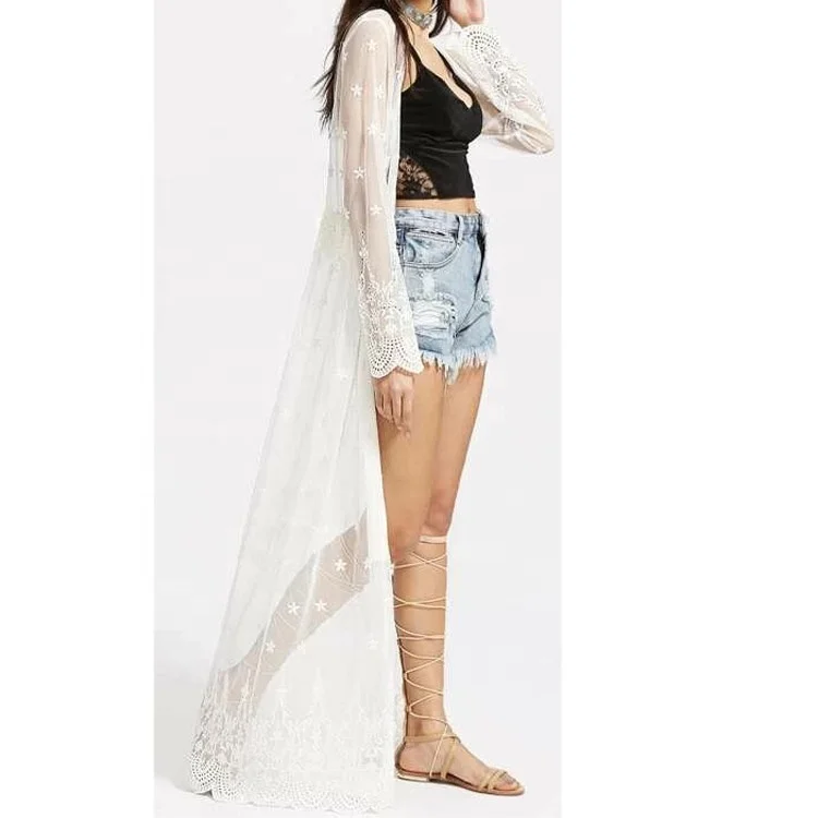 Latest Fashion Long Sleeve Beach Kimono Crochet Trim Embroidered Sheer Maxi Kimono