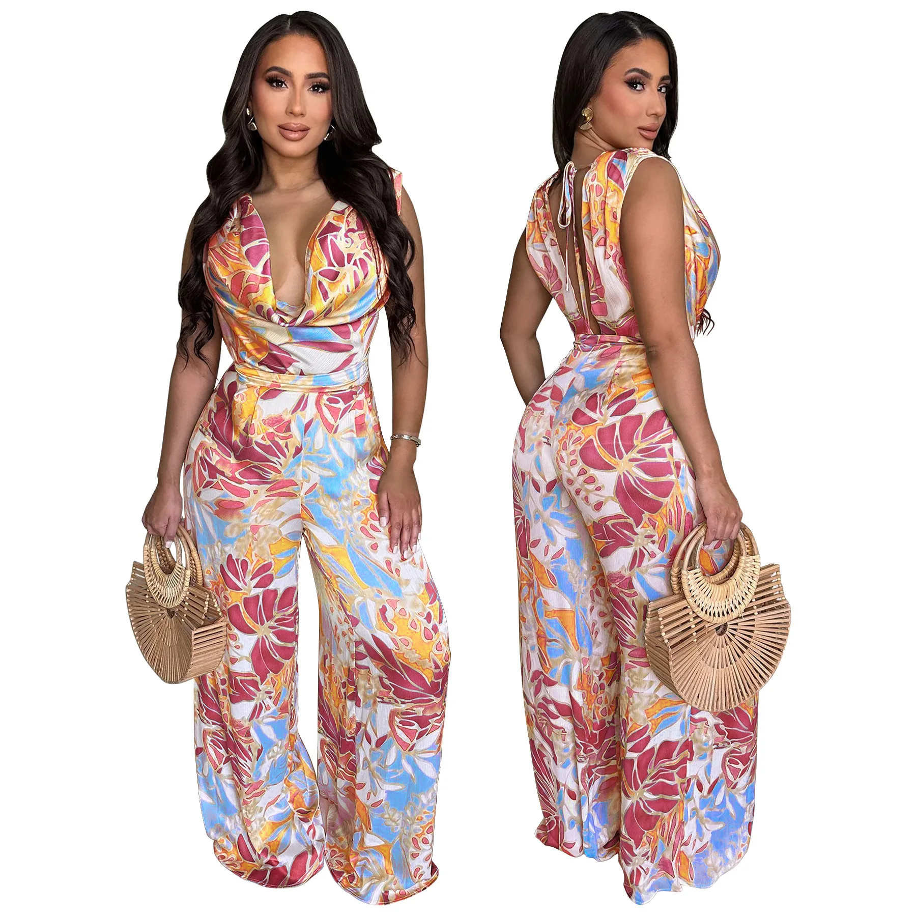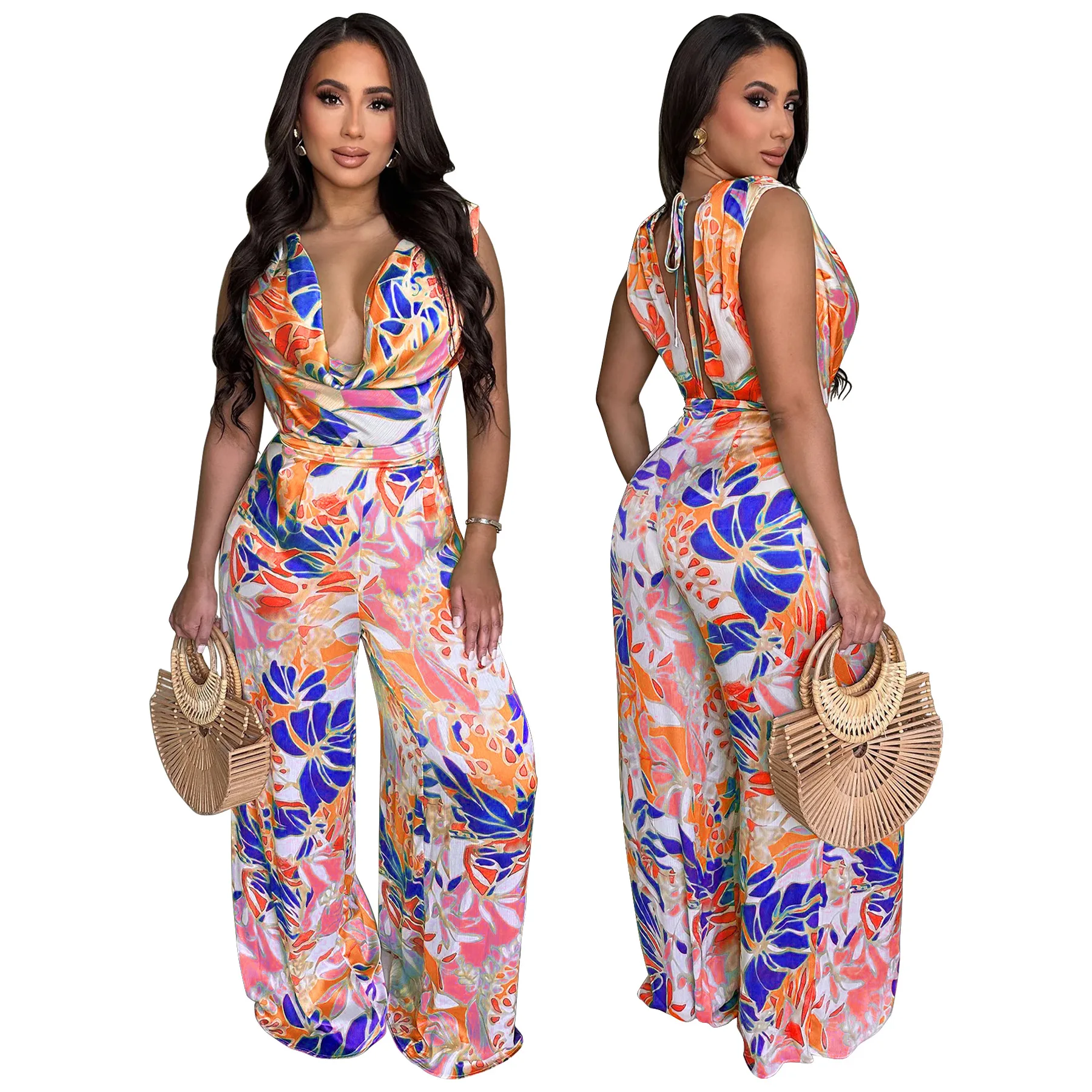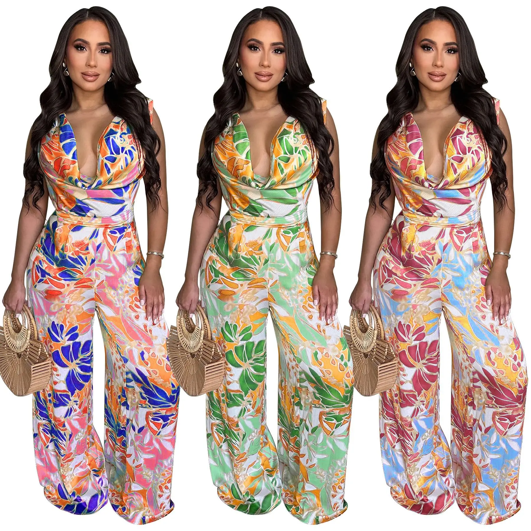 Wholesale Casual Wide Leg Pants Set and Colorful Deep V Neck One Piece Jumpsuit for Women