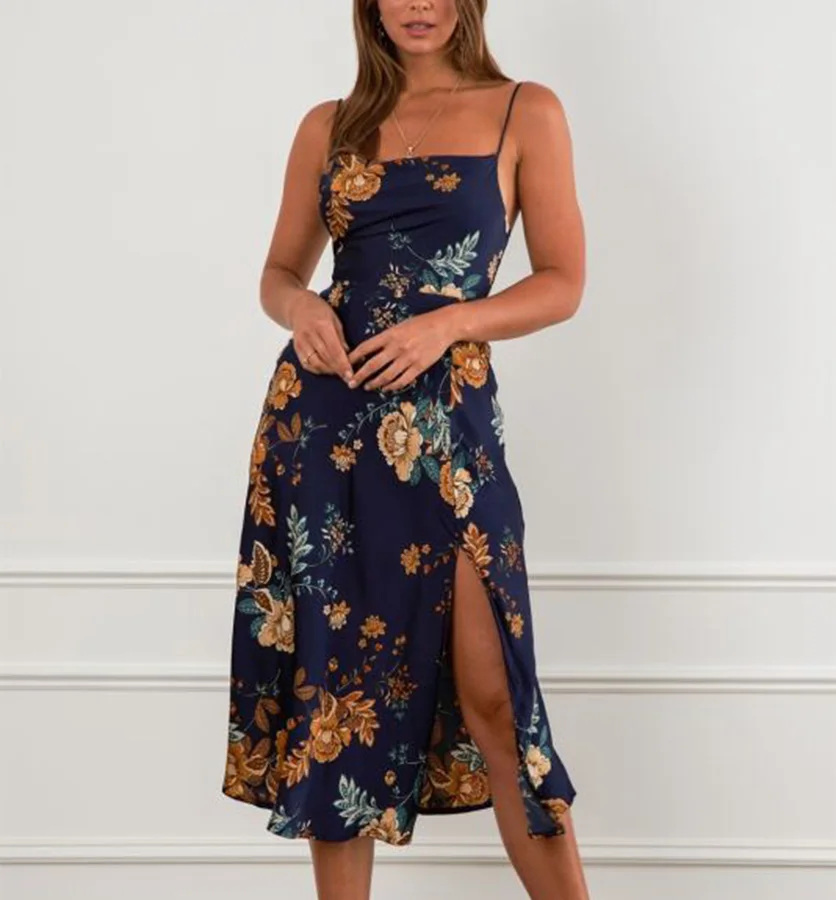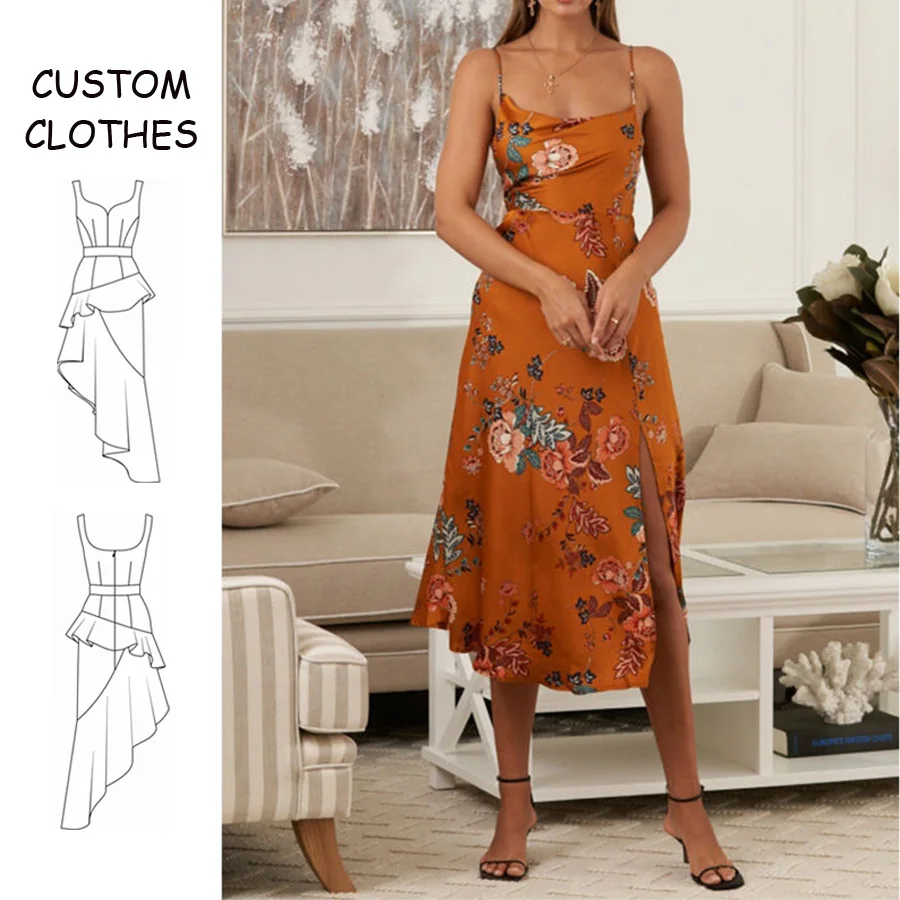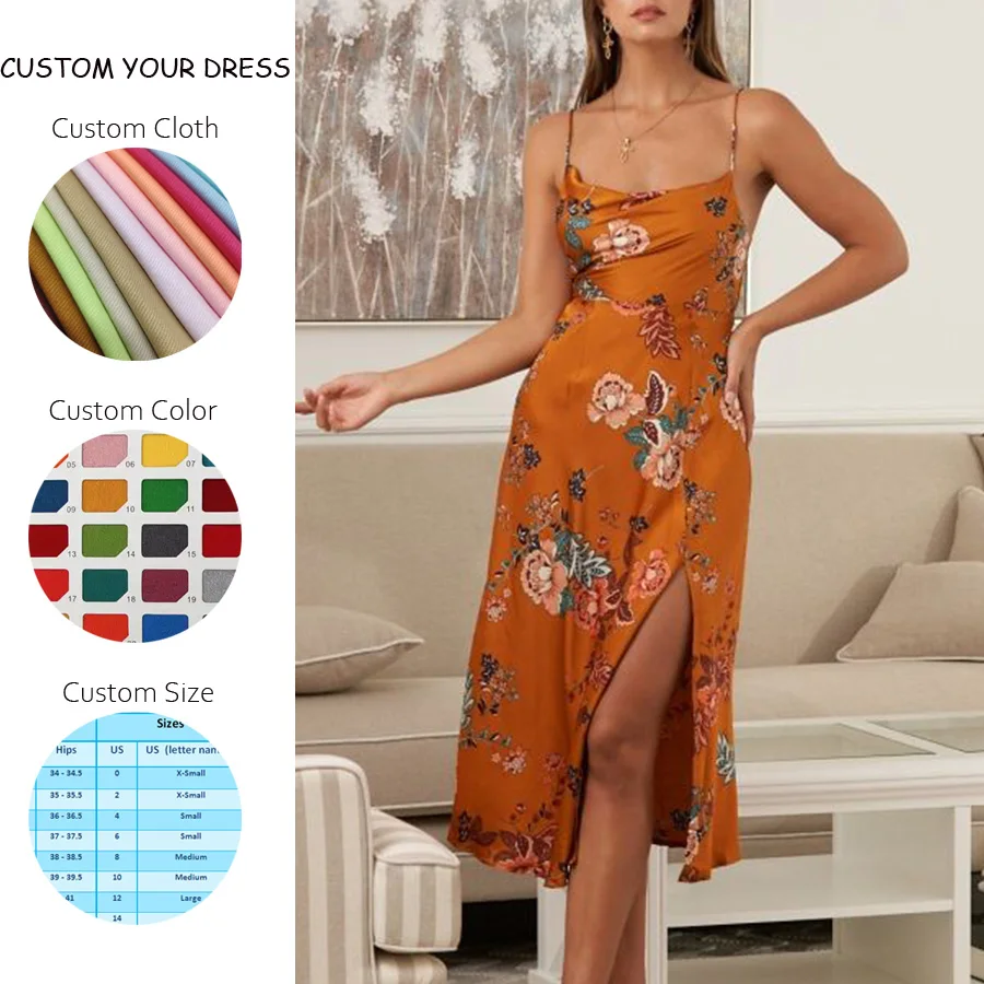 OEM Women Casual Midi Floral Woven Satin Dresses with Zippers Custom Cowl Neck High Slit Sexy Washable for Summer