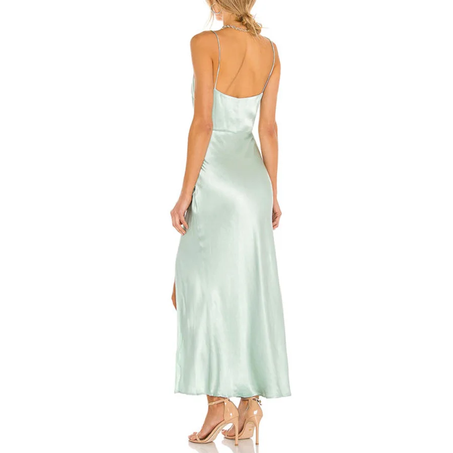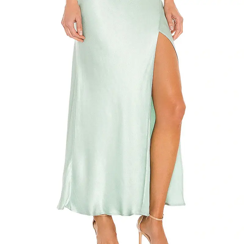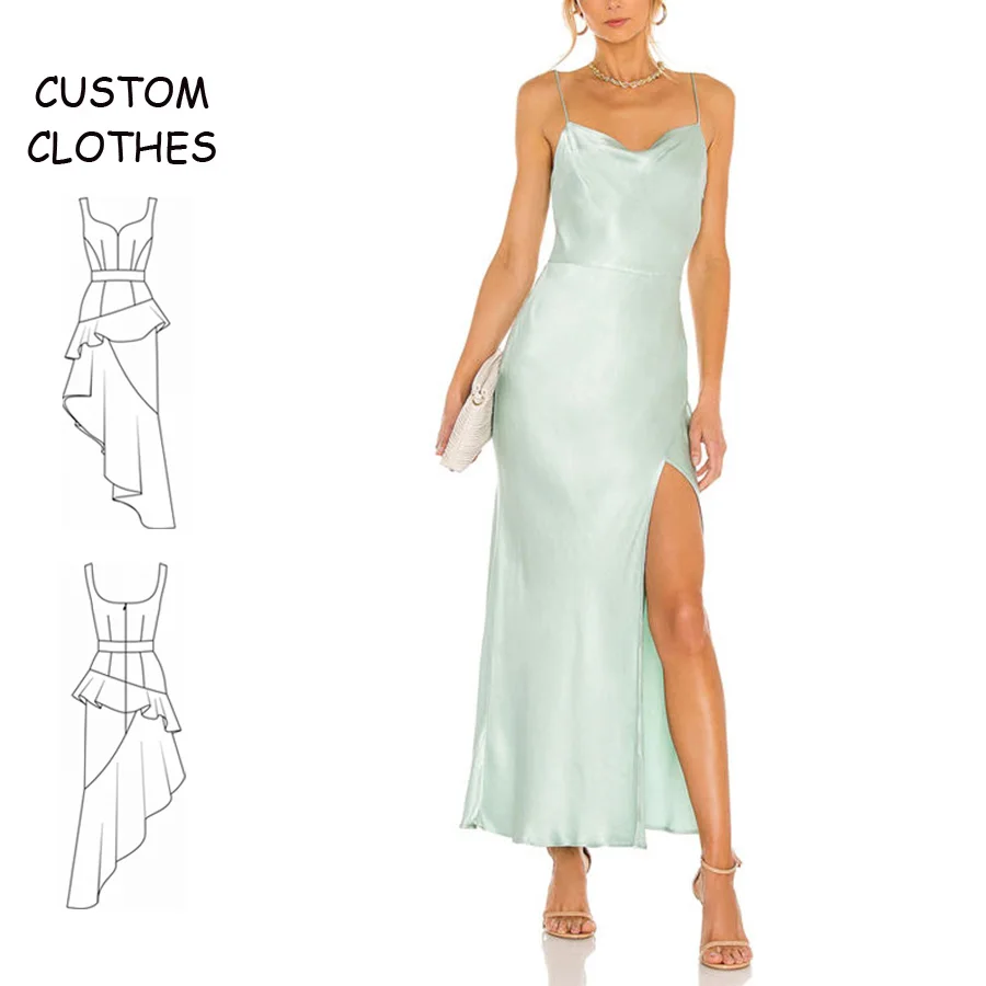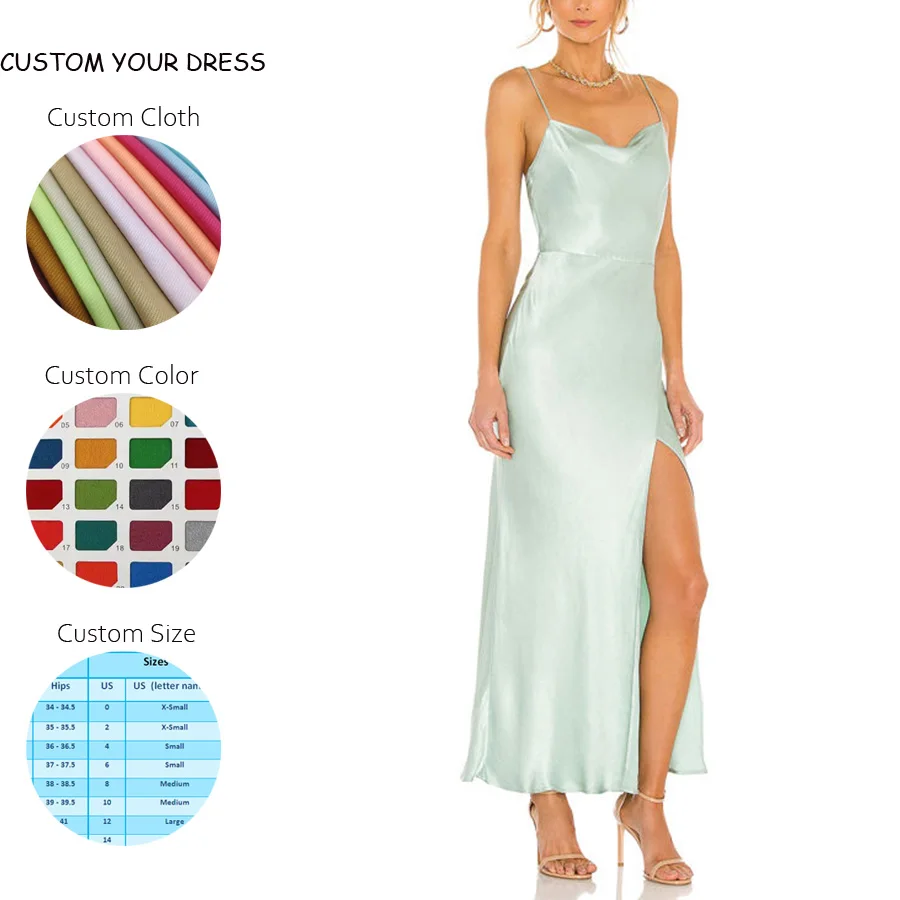 OEM Factory Price Sexy Custom Women Casual Summer Solid Plain Dyed Daily Draped Collar Zippers High Slit Satin Maxi Natural