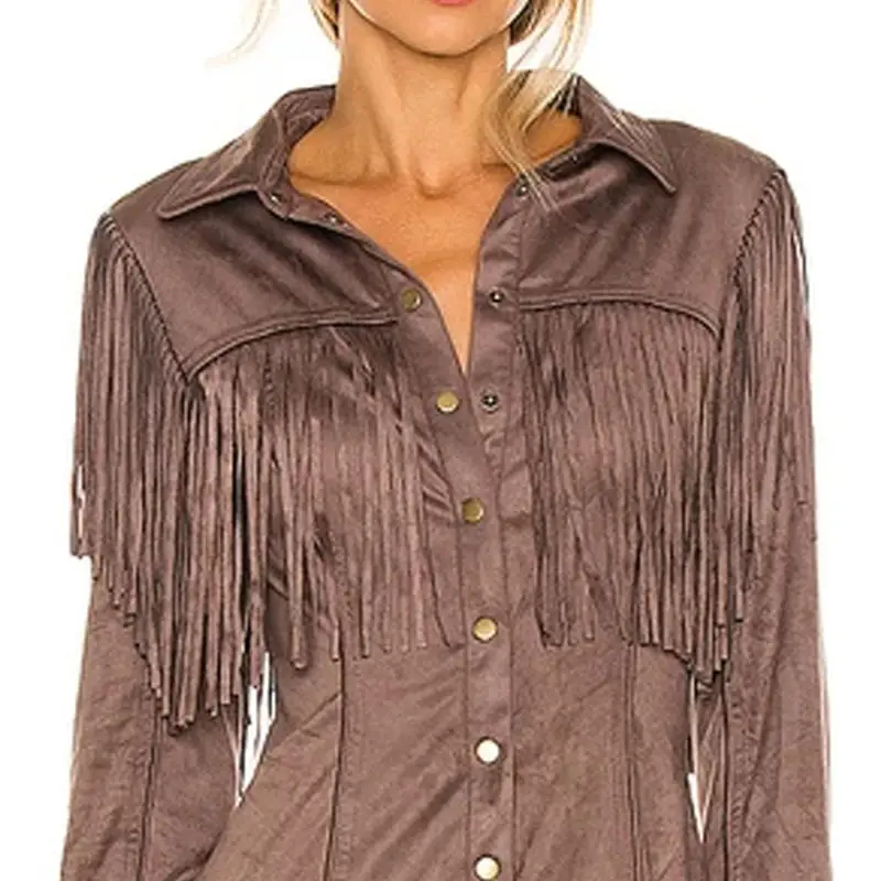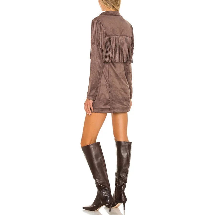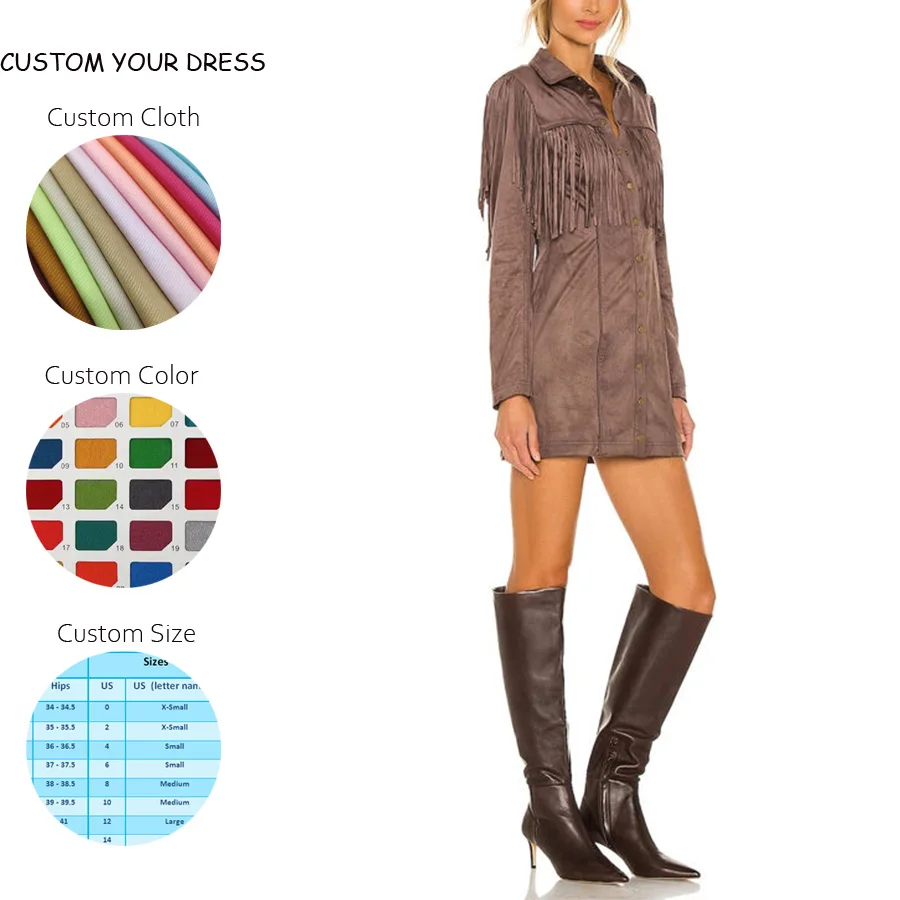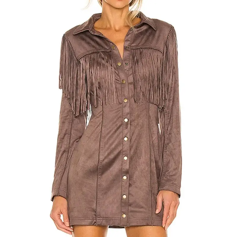 OEM Women's Custom Vintage Casual Spring Solid Long Sleeve Button-Up Faux Suede Tassel Mini Dress