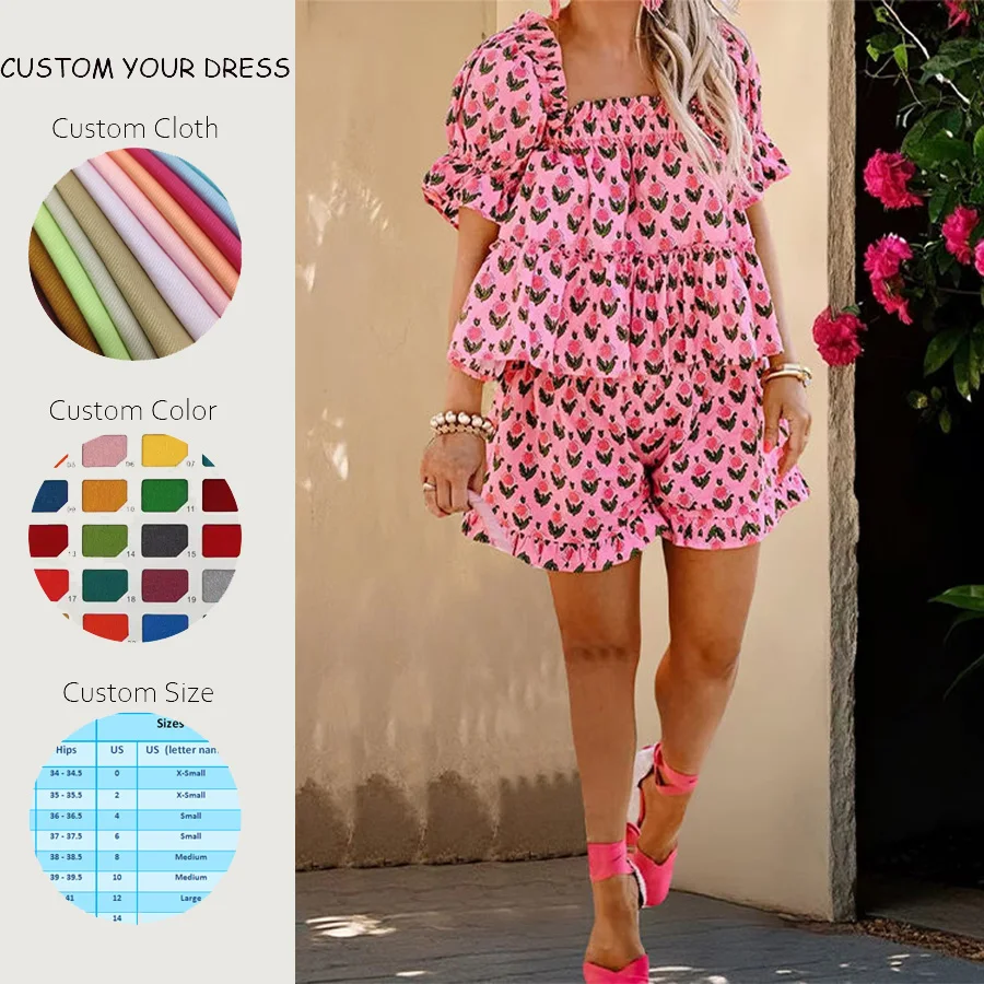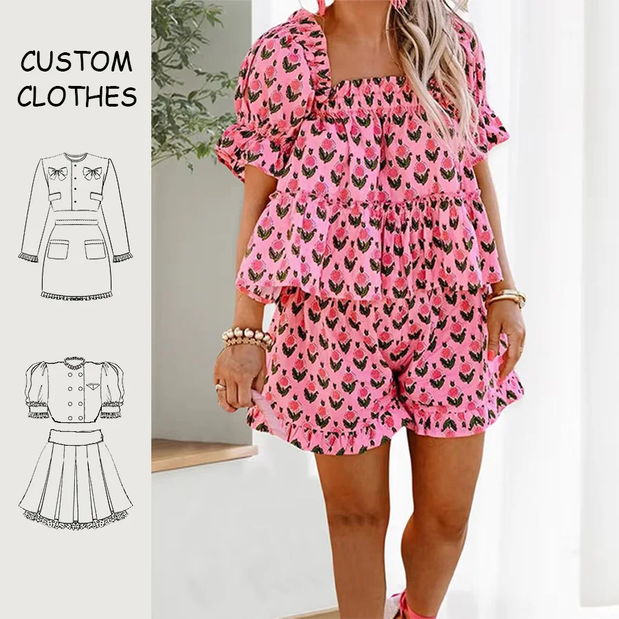 Women's 2-Piece Casual Floral Loungewear Set Bow Collar Terry Fabric Eco-Friendly 100% Cotton Drawstring Pockets OEM Custom Logo