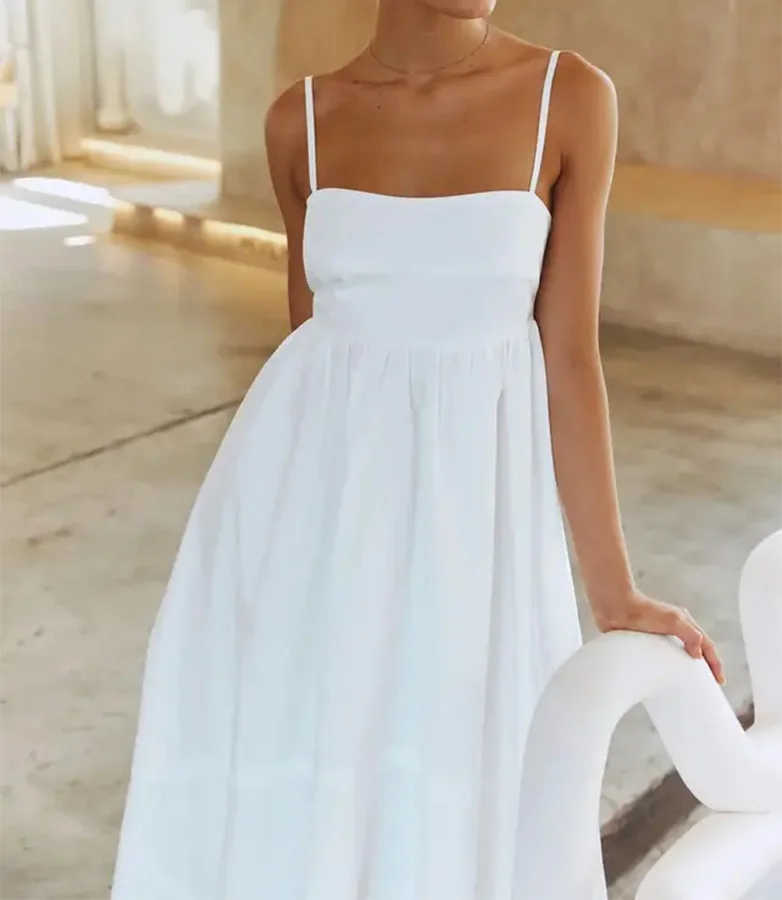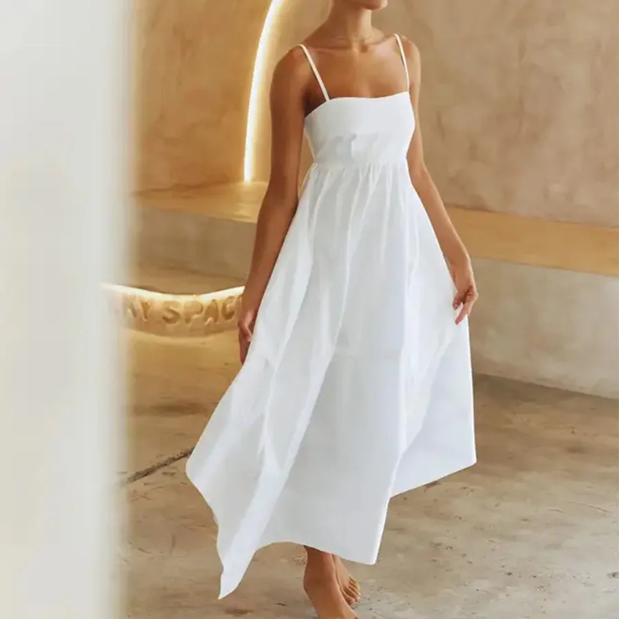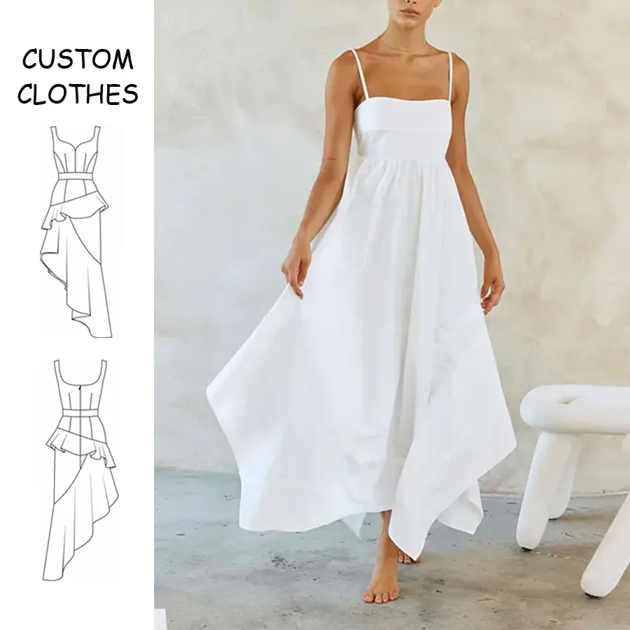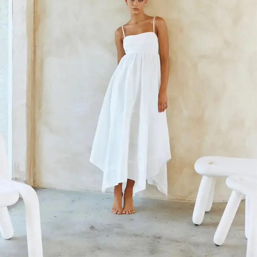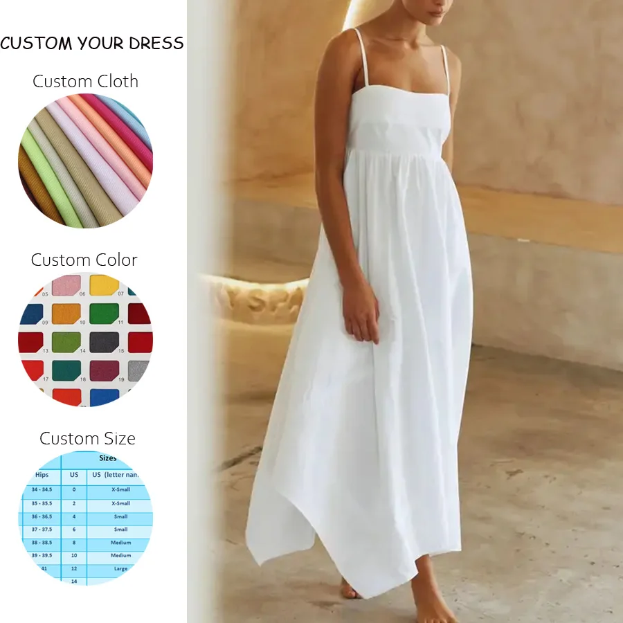 OEM Fashion Elegant Women Custom Asymmetric Hemline Casual Dresses Solid Woven Cotton White Regular Fit Midi Dress Daily Outfit