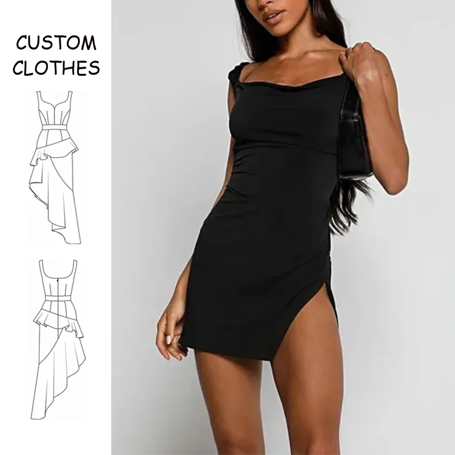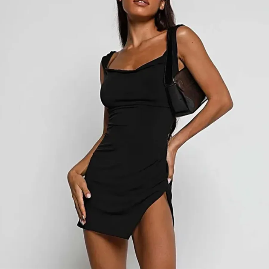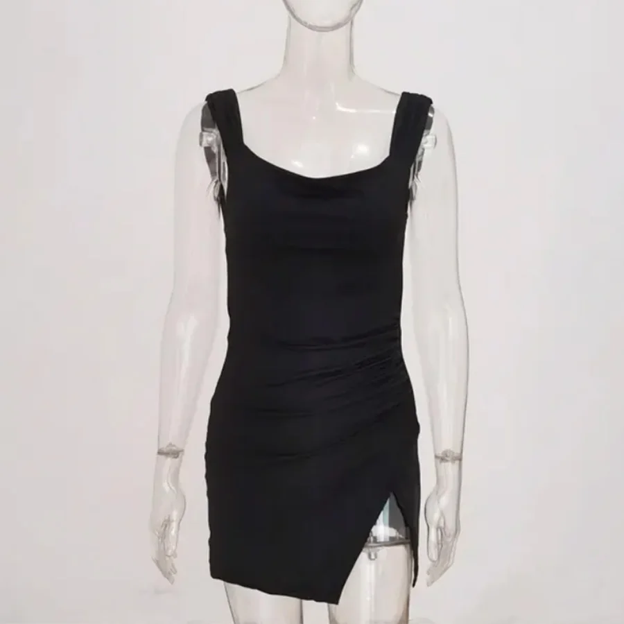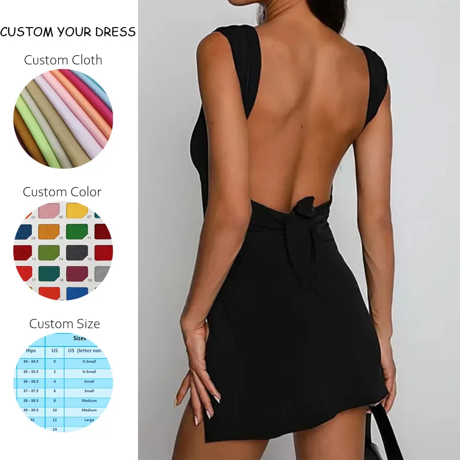 OEM Solid Natural Casual Simple Style Custom Square Neck Sleeveless Sexy Dresses Clubwear Party Black Lace-Up Backless Ladies